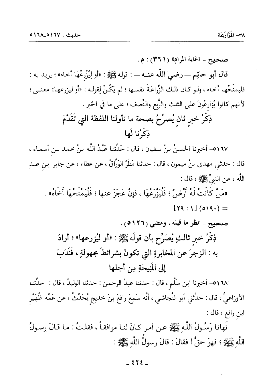 ذِكْرُ خَبَرٍ ثَالِثٍ يُصَرِّحُ بِأَنَّ قَوْلَهُ صَلَّى اللَّهُ عَلَيْهِ وَسَلَّمَ: (أَوْ لِيُزْرِعْهَا) أَرَادَ بِهِ الزَّجْرَ عَنِ الْمُخَابَرَةِ الَّتِي تَكُونُ بِشَرَائِطَ مَجْهُولَةٍ فَنُدِبَ إِلَى الْمَنِيحَةِ مِنْ أَجْلِهَا