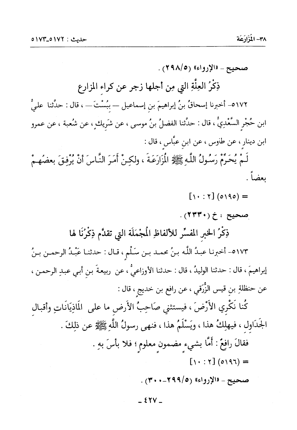 5173 - أَخْبَرَنَا عَبْدُ اللَّهِ بْنُ مُحَمَّدِ بْنِ سَلْمٍ قَالَ: حَدَّثَنَا عَبْدُ الرَّحْمَنِ بْنُ إِبْرَاهِيمَ قَالَ: حَدَّثَنَا الْوَلِيدُ قَالَ: حَدَّثَنَا الْأَوْزَاعِيُّ عَنْ رَبِيعَةَ بْنِ أَبِي عَبْدِ الرَّحْمَنِ عَنْ حنظلة بن قَيْسٍ الزُّرَقِيُّ عَنْ رَافِعِ بْنِ خَدِيجٍ قَالَ: