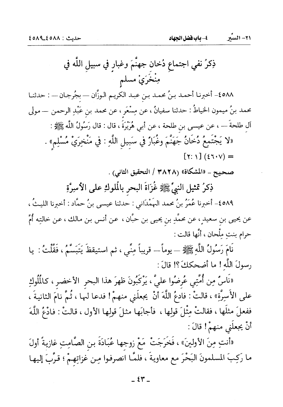 نَاسٌ مِنْ أُمَّتِي عُرِضُوا عَلَيَّ يَرْكَبُونَ ظَهْرَ هَذَا الْبَحْرِ الْأَخْضَرِ كَالْمُلُوكِ عَلَى الْأَسِرَّةِ قَالَتْ: فَادْعُ اللَّهَ أَنْ يَجْعَلَنِي مِنْهُمْ فَدَعَا لَهَا ثُمَّ نَامَ الثَّانِيَةَ فَفَعَلَ مِثْلَهَا فَقَالَتْ مِثْلَ قَوْلِهَا فَأَجَابَهَا مِثْلَ قَوْلِهَا الْأَوَّلِ قَالَتْ: فَادْعُ اللَّهَ أَنْ يَجْعَلَنِي مِنْهُمْ قَالَ: