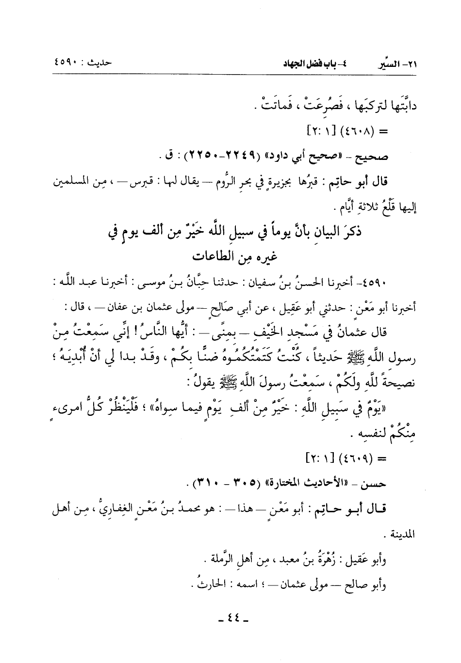 4590 - أَخْبَرَنَا الْحَسَنُ بْنُ سُفْيَانَ حَدَّثَنَا حِبَّانُ بْنُ مُوسَى أَخْبَرَنَا عَبْدُ اللَّهِ أَخْبَرَنَا أَبُو مِعَنٍ حَدَّثَنِي أَبُو عَقِيلٍ عَنْ أَبِي صَالِحٍ مَوْلَى عُثْمَانَ بْنِ عَفَّانَ قَالَ: