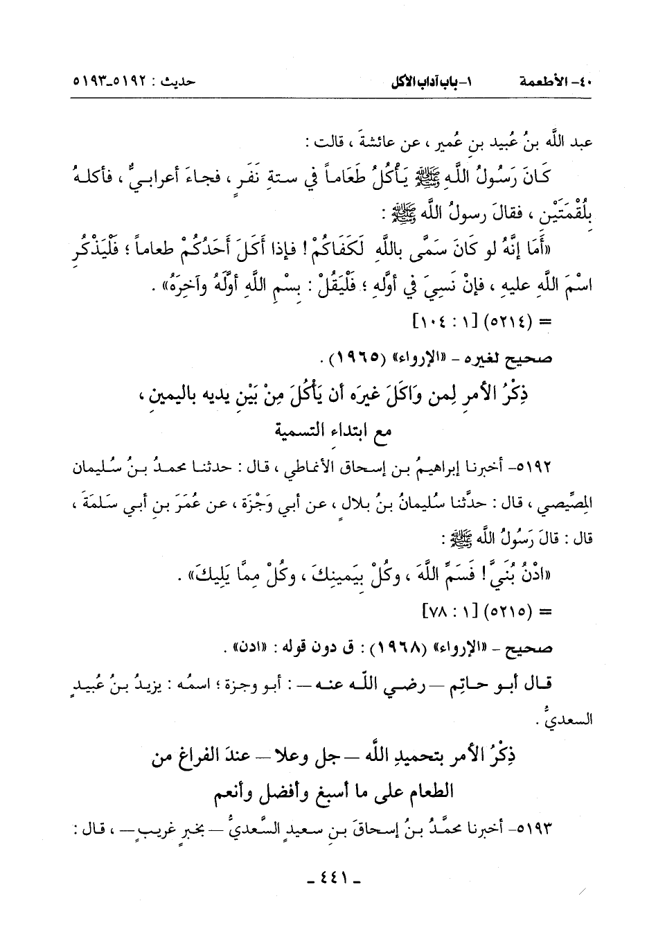 (بَلْ إِذَا أَصَبْتُمْ مِثْلَ هَذَا فَضَرَبْتُمْ بِأَيْدِيكُمْ فَقُولُوا بِسْمِ اللَّهِ وَإِذَا شَبِعْتُمْ فَقُولُوا: الْحَمْدُ لِلَّهِ الَّذِي هُوَ أَشْبَعَنَا وَأَنْعَمَ عَلَيْنَا وَأَفْضَلَ فَإِنَّ هَذَا كفافٌ بِهَا) فَلَمَّا نَهَضَ قَالَ لِأَبِي أَيُّوبَ: