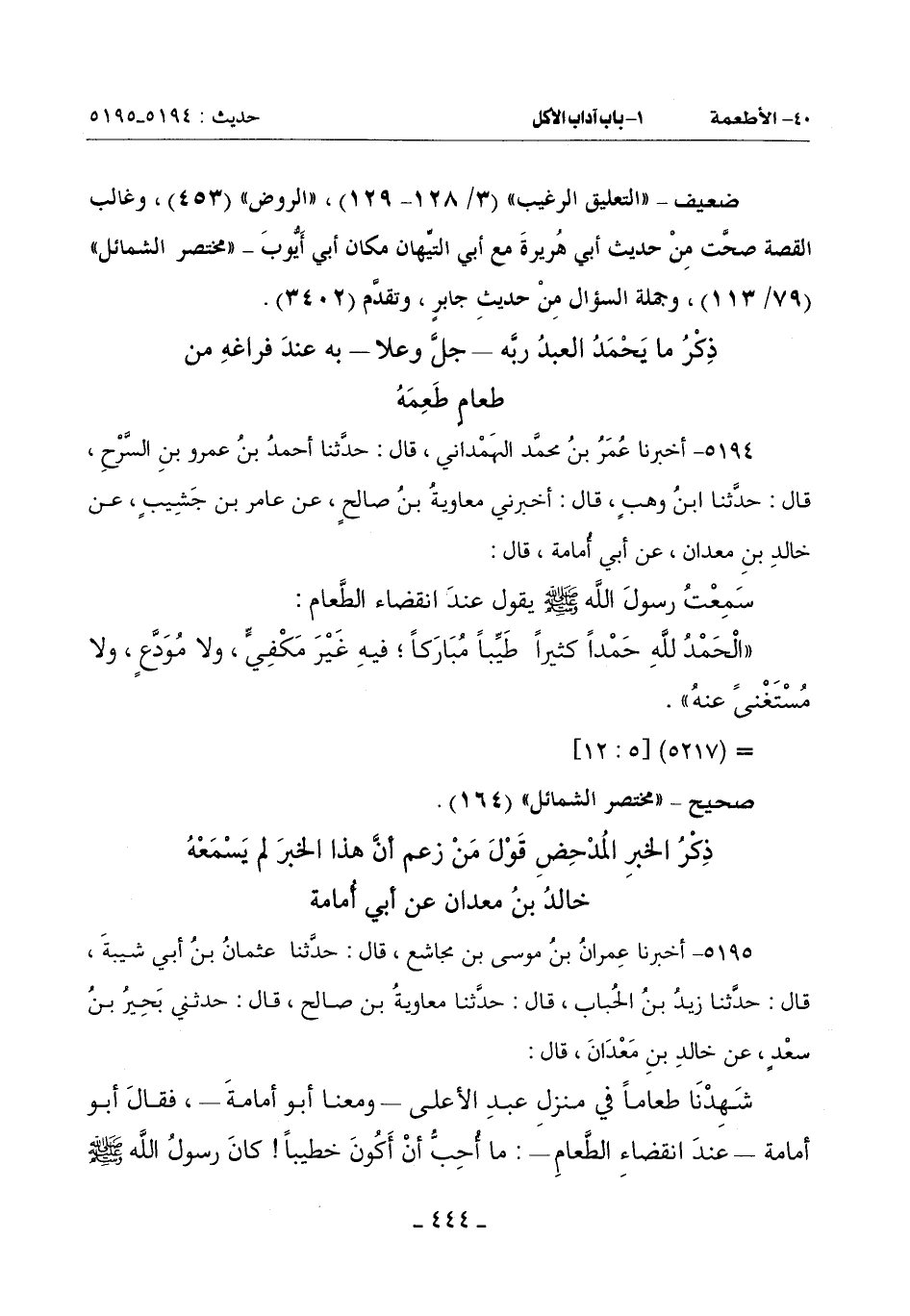 شَهِدْنَا طَعَامًا فِي مَنْزِلِ عَبْدِ الْأَعْلَى ـ وَمَعَنَا أَبُو أُمَامَةَ ـ فَقَالَ أَبُو أُمَامَةَ ـ عِنْدَ انْقِضَاءِ الطَّعَامِ ـ: مَا أُحِبُّ أَنْ أَكُونَ خَطِيبًا كَانَ رَسُولُ اللَّهِ صَلَّى اللَّهُ عَلَيْهِ وَسَلَّمَ -[445]- يَقُولُ عِنْدَ انْقِضَاءِ الطَّعَامِ: