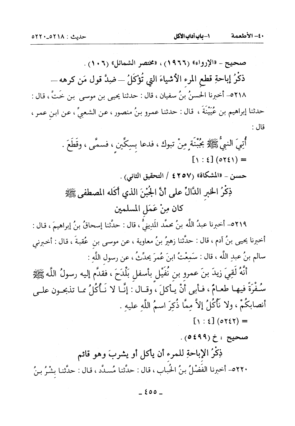 5218 - أَخْبَرَنَا الْحَسَنُ بْنُ سُفْيَانَ قَالَ: حَدَّثَنَا يَحْيَى بْنُ مُوسَى بْنِ خَتَّ قَالَ: حَدَّثَنَا إِبْرَاهِيمُ بْنُ عُيَيْنَةَ قَالَ: حَدَّثَنَا عَمْرُو بْنُ مَنْصُورٍ عَنِ الشَّعْبِيِّ عَنِ ابْنِ عُمَرَ قَالَ: