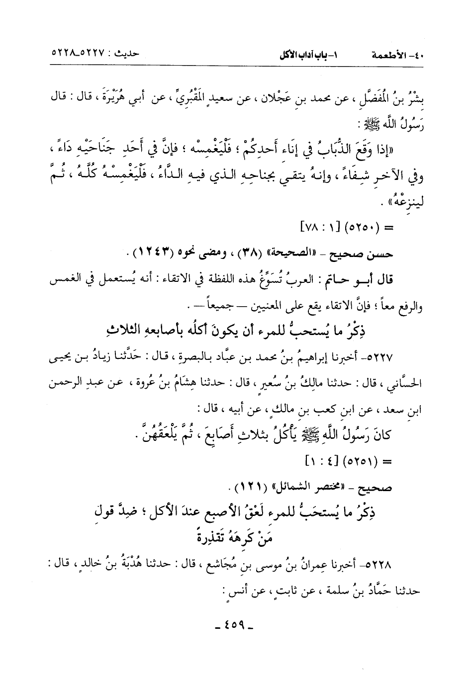 5228 - أَخْبَرَنَا عِمْرَانُ بْنُ مُوسَى بْنِ مُجَاشِعٍ قَالَ: حَدَّثَنَا هُدْبَةُ بْنُ خَالِدٍ قَالَ: حَدَّثَنَا حَمَّادُ بْنُ سَلَمَةَ عَنْ ثَابِتٍ عَنْ أَنَسٍ: -[460]-