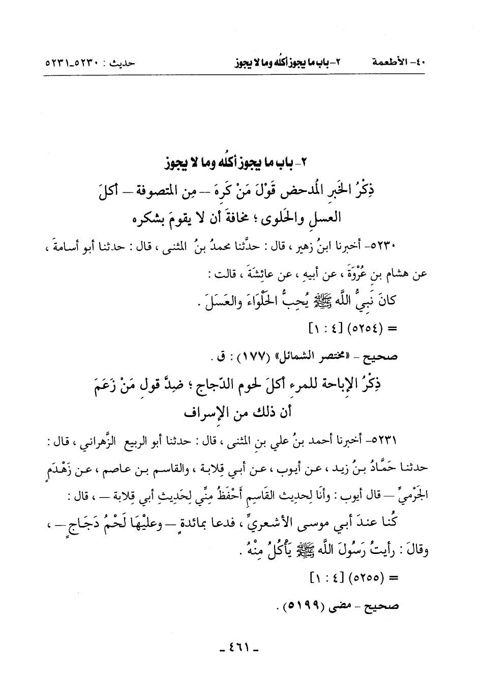 5230 - أَخْبَرَنَا ابْنُ زُهَيْرٍ قَالَ: حَدَّثَنَا مُحَمَّدُ بْنُ الْمُثَنَّى قَالَ: حَدَّثَنَا أَبُو أُسَامَةَ عَنْ هِشَامِ بْنِ عُرْوَةَ عَنْ أبيه عن عائشة قالت: