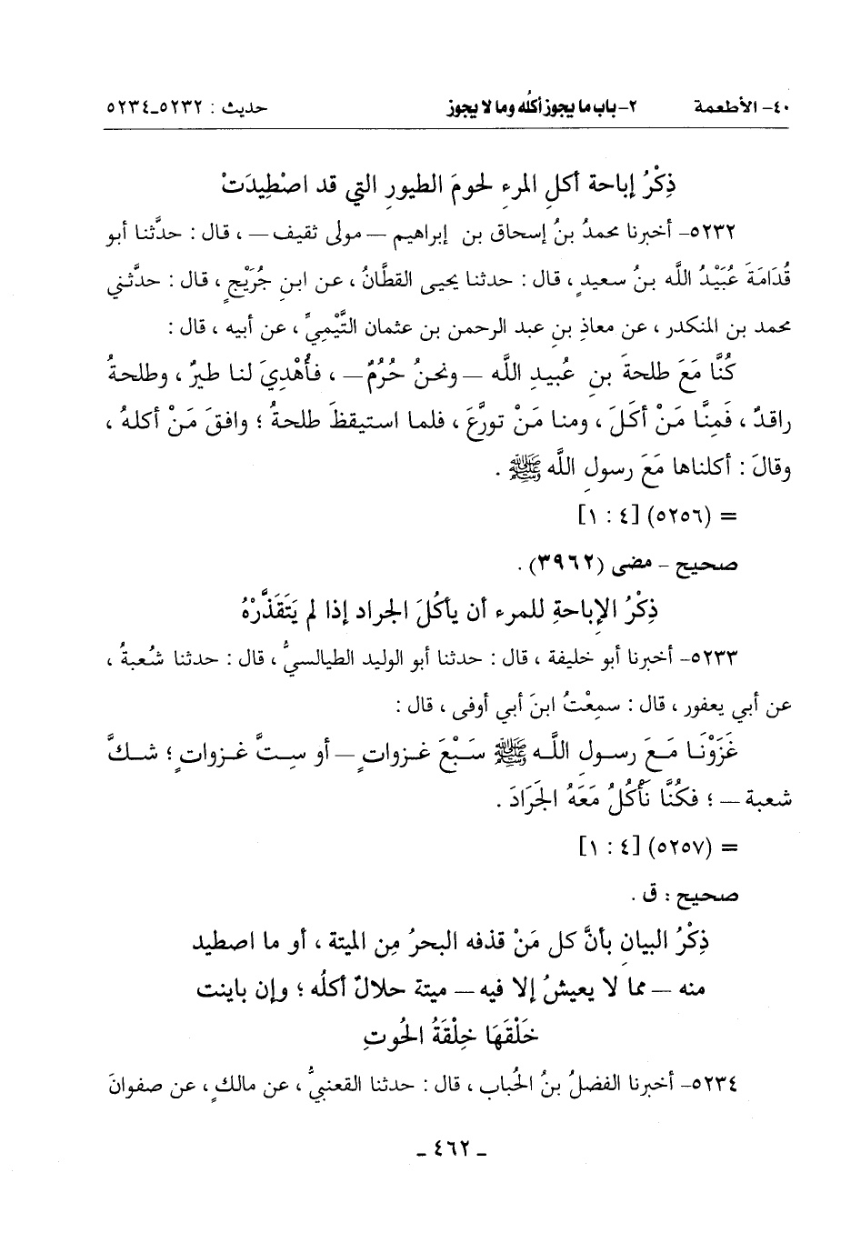 كُنَّا مَعَ طَلْحَةَ بْنِ عُبَيْدِ اللَّهِ ـ وَنَحْنُ حُرُمٌ ـ فَأُهْدِيَ لَنَا طَيْرٌ وَطَلْحَةُ رَاقِدٌ فَمِنَّا مَنْ أَكَلَ وَمِنَّا مَنْ تَوَرَّعَ فَلَمَّا اسْتَيْقَظَ طَلْحَةُ وَافَقَ مَنْ أَكَلَهُ وَقَالَ: أَكَلْنَاهَا مَعَ رَسُولِ اللَّهِ صَلَّى اللَّهُ عَلَيْهِ وَسَلَّمَ