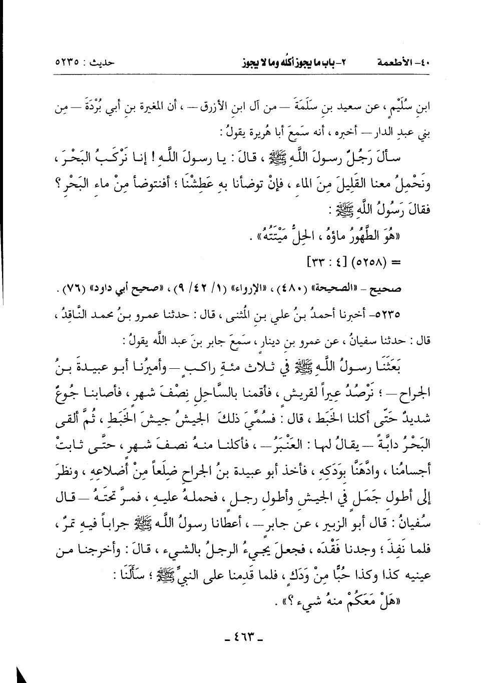 بَعَثَنَا رَسُولُ اللَّهِ صَلَّى اللَّهُ عَلَيْهِ وَسَلَّمَ في ثلاث مئة رَاكِبٍ ـ وَأَمِيرُنَا أَبُو عُبَيْدَةَ بْنُ الْجَرَّاحِ ـ نَرْصُدُ عِيرًا لِقُرَيْشٍ فَأَقَمْنَا بِالسَّاحِلِ نِصْفَ شَهْرٍ فَأَصَابَنَا جوعٌ شَدِيدٌ حَتَّى أَكَلْنَا الْخَبَطَ قَالَ: فسُمِّي ذَلِكَ الْجَيْشُ جَيْشَ الْخَبَطِ ثُمَّ أَلْقَى الْبَحْرُ دَابَّةً ـ يُقَالُ لَهَا: الْعَنْبَرُ ـ فَأَكَلْنَا مِنْهُ نِصْفَ شَهْرٍ حَتَّى ثَابَتْ أَجْسَامُنَا وادَّهَنَّا بِوَدَكِهِ فَأَخَذَ أَبُو عُبَيْدَةَ بْنُ الْجَرَّاحِ ضِلَعاً مِنْ أَضْلَاعِهِ وَنَظَرَ إِلَى أَطْوَلِ جَمَلٍ فِي الْجَيْشِ وَأَطْوَلِ رَجُلٍ فَحَمَلَهُ عَلَيْهِ فَمَرَّ تَحْتَهُ ـ قَالَ سُفْيَانُ: قَالَ أَبُو الزُّبَيْرٍ عَنْ جَابِرٍ ـ: أَعْطَانَا رَسُولُ اللَّهِ صَلَّى اللَّهُ عَلَيْهِ وَسَلَّمَ جِرَابًا فِيهِ تمر فلما نفذَ وَجَدْنَا فَقْدَهُ فَجَعَلَ يَجِيءُ الرَّجُلُ بِالشَّيْءِ قَالَ: وَأَخْرَجْنَا مِنْ عَيْنَيْهِ كَذَا وَكَذَا حُبًّا مِنْ وَدَكِ فَلَمَّا قَدِمنا عَلَى النَّبِيِّ صَلَّى اللَّهُ عَلَيْهِ وَسَلَّمَ سَأَلَنَا: