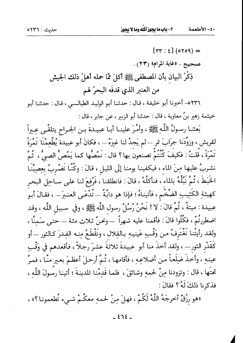 بَعَثَنَا رَسُولُ اللَّهِ صَلَّى اللَّهُ عَلَيْهِ وَسَلَّمَ وأمَّر عَلَيْنَا أَبَا عُبَيْدَةَ بْنَ الْجَرَّاحِ يَتَلَقَّى عِيرًا لِقُرَيْشٍ وزوَّدِنا جِرَابَ تَمْرٍ ـ لَمْ يَجِدْ لَنَا غَيْرَهُ ـ فَكَانَ أَبُو عُبَيْدَةَ يُطْعِمُنَا تَمْرَةً تَمْرَةً قُلْتُ: فَكَيْفَ كُنْتُمْ تَصْنَعُونَ بِهَا؟ قَالَ: نمُصُّها كَمَا يَمُصُّ الصَّبِيُّ ثُمَّ نَشْرَبُ عَلَيْهَا مِنَ الْمَاءِ فَيَكْفِينَا يَوْمَنَا إِلَى اللَّيْلِ قَالَ: وَكُنَّا نَضْرِبُ بِعِصِيِّنَا الْخَبَطَ ثُمَّ نَبُلُّهُ بِالْمَاءِ فَنَأْكُلُهُ قَالَ: فَانْطَلَقْنَا فرُفِعَ لَنَا عَلَى سَاحِلِ الْبَحْرِ كَهَيْئَةِ الْكَثِيبِ الضَّخْمِ فَأَتَيْنَاهُ فَإِذَا هُوَ دَابَّةٌ ـ تُدْعَى الْعَنْبَرَ ـ فَقَالَ أَبُو عُبَيْدَةَ: مَيْتَةٌ ثُمَّ قَالَ: لَا نَحْنُ رُسُلُ رَسُولُ اللَّهِ صَلَّى اللَّهُ عَلَيْهِ وَسَلَّمَ وَفِي سَبِيلِ اللَّهِ وَقَدِ اضْطُرِرْتُمْ فَكُلُوا قَالَ: فَأَقَمْنَا عَلَيْهِ شهراً ـ ونحن ثلاث مئة ـ حَتَّى سَمِنَّا وَلَقَدْ رَأَيْتُنَا نَغْتَرِفُ مِنْ وَقَبِ عَيْنَيْهِ بِالْقِلَالِ وَنَقْطَعُ مِنْهُ الْفِدَرَ كَالثَّوْرِ ـ أَوْ كَقَدْرِ الثَّوْرِ ـ وَلَقَدْ أَخَذَ مِنَّا أَبُو عُبَيْدَةَ ثَلَاثَةَ عَشَرَ رَجُلًا فَأَقْعَدَهُمْ فِي وَقْبِ عَيْنِهِ وَأَخَذَ ضِلَعًا مِنْ أَضْلَاعِهِ فَأَقَامَهَا ثُمَّ أَرْحَلَ أَعْظَمَ بعيرٍ مِنَّا فَمَرَّ تَحْتَهَا قَالَ: وَتَزَوَّدْنَا مِنْ لَحْمِهِ وَشَائِقَ فَلَمَّا قَدِمْنَا الْمَدِينَةَ أَتَيْنَا رسول الله فَذَكَرْنَا ذَلِكَ لَهُ فَقَالَ: