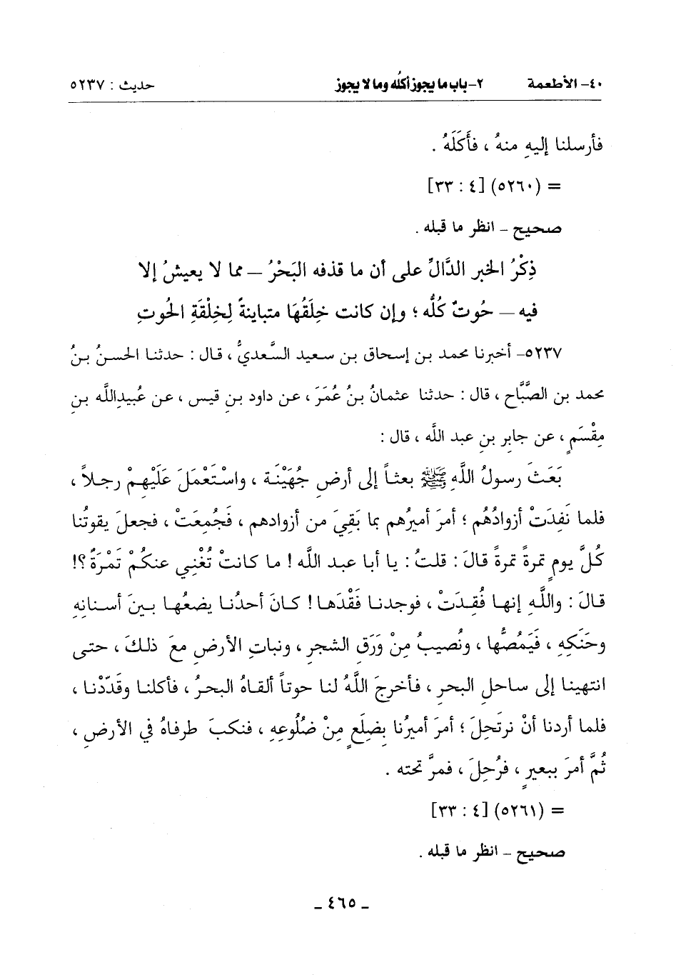 بَعَثَ رَسُولُ اللَّهِ صَلَّى اللَّهُ عَلَيْهِ وَسَلَّمَ بَعْثًا إِلَى أَرْضِ جُهَيْنَةَ وَاسْتَعْمَلَ عَلَيْهِمْ رَجُلًا فَلَمَّا نَفِدَتْ أَزْوَادُهُمْ أَمَرَ أَمِيرُهُمْ بِمَا بَقِيَ مِنْ أَزْوَادِهِمْ فَجُمِعَتْ فَجَعَلَ يُقَوِّتُنَا كُلَّ يَوْمٍ تَمْرَةً تَمْرَةً قَالَ: قُلْتُ: يَا أَبَا عَبْدِ اللَّهِ مَا كَانَتْ تُغْنِي عَنْكُمْ تَمْرَةٌ؟ قَالَ: وَاللَّهِ إِنَّهَا فُقِدَتْ فَوَجَدْنَا فَقْدَهَا كَانَ أَحَدُنَا يَضَعُهَا بَيْنَ أَسْنَانِهِ وَحَنَكِهِ فَيَمُصُّها ونُصيبُ مِنْ وَرَقِ الشَّجَرِ وَنَبَاتِ الْأَرْضِ مَعَ ذَلِكَ حَتَّى انْتَهَيْنَا إِلَى سَاحِلِ الْبَحْرِ فَأَخْرَجَ اللَّهُ لَنَا حُوتًا أَلْقَاهُ الْبَحْرُ فَأَكَلْنَا وقَدَدْنا فَلَمَّا أَرَدْنَا أَنْ نَرْتَحِلَ أَمَرَ أَمِيرُنَا بِضِلْعٍ مِنْ ضُلُوعِهِ فَنَكَبَ طَرَفَاهُ فِي الْأَرْضِ ثُمَّ أَمَرَ بِبَعِيرٍ فرُحِلَ فمرَّ تحته