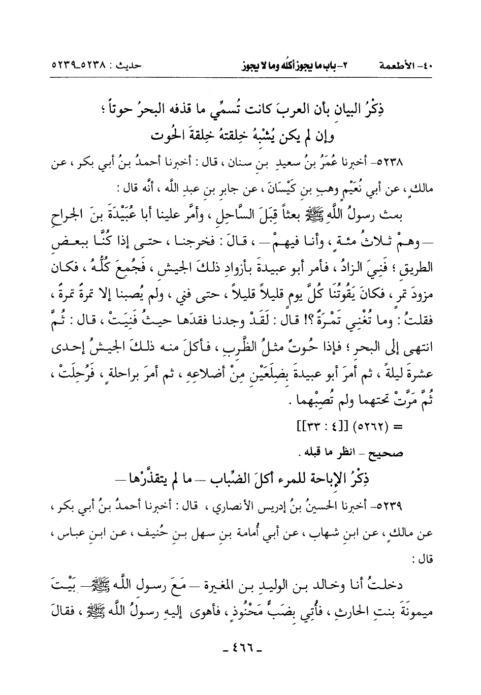 (لَا وَلَكِنْ لَمْ يَكُنْ بِأَرْضِ قَوْمِي فأَجِدُني أَعَافُهُ) قَالَ خَالِدُ بْنُ الْوَلِيدِ: فَاجْتَرَرْتُهُ فَأَكَلْتُهُ وَرَسُولُ اللَّهِ صَلَّى اللَّهُ عَلَيْهِ وَسَلَّمَ ينظرُ