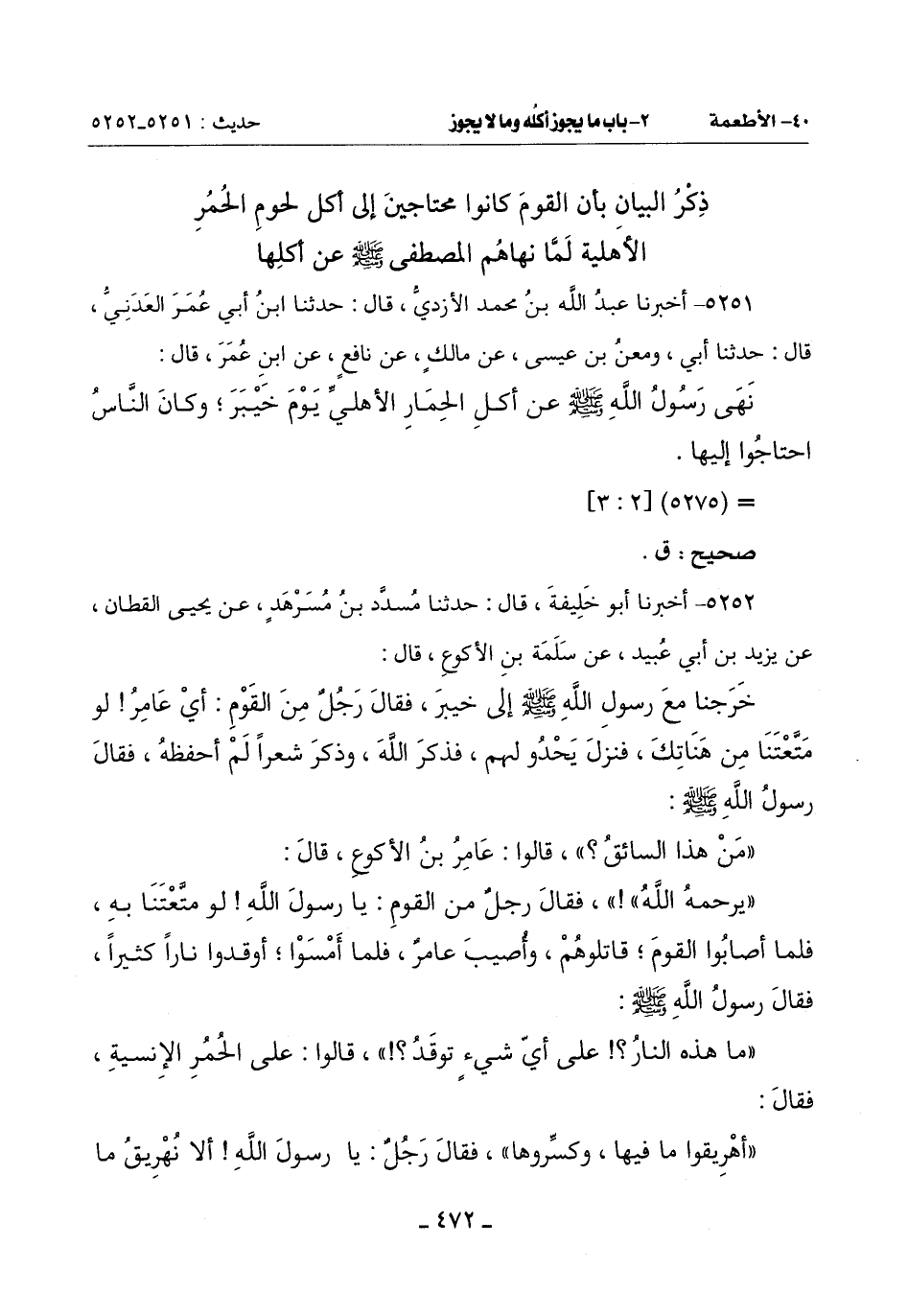 5252 - أَخْبَرَنَا أَبُو خَلِيفَةَ قَالَ: حَدَّثَنَا مُسَدَّدُ بْنُ مُسَرْهَدٍ عَنْ يَحْيَى الْقَطَّانِ عَنْ يَزِيدَ بْنِ أَبِي عُبَيْدٍ عَنْ سَلَمَةَ بْنَ الْأَكْوَعِ قَالَ: