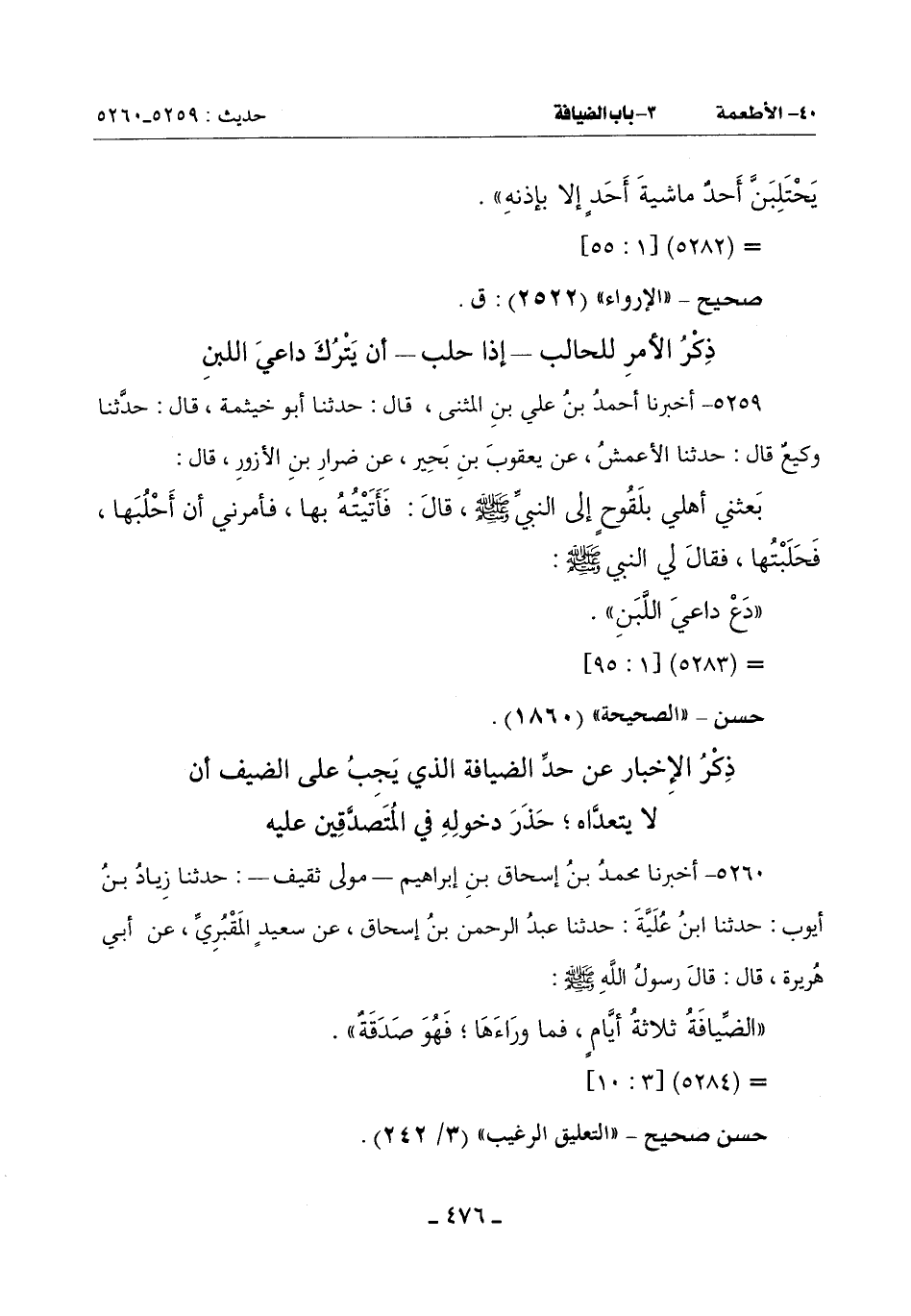 5259 - أَخْبَرَنَا أَحْمَدُ بْنُ عَلِيِّ بْنِ الْمُثَنَّى قَالَ: حَدَّثَنَا أَبُو خَيْثَمَةَ قَالَ: حَدَّثَنَا وَكِيعٌ قَالَ: حَدَّثَنَا الْأَعْمَشُ عَنْ يَعْقُوبَ بْنِ بَحِيرٍ عَنْ ضِرَارِ بْنِ الْأَزْوَرِ قَالَ: