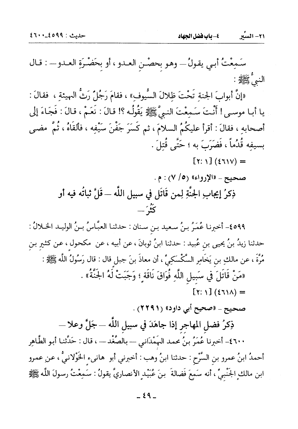 4599 - أَخْبَرَنَا عُمَرُ بْنُ سَعِيدِ بْنِ سِنَانٍ حَدَّثَنَا الْعَبَّاسُ بْنُ الْوَلِيدِ الْخَلَّالُ حَدَّثَنَا زَيْدُ بْنُ يَحْيَى بْنِ عُبَيْدٍ حَدَّثَنَا ابْنُ ثَوْبَانَ عَنْ أَبِيهِ عَنْ مَكْحُولٍ عَنْ كَثِيرِ بْنِ مُرَّةَ عَنْ مَالِكِ بْنِ يَخَامِرَ السَّكْسَكِيِّ أَنَّ مُعَاذَ بْنَ جَبَلٍ قَالَ: قَالَ رَسُولُ اللَّهِ صَلَّى اللَّهُ عَلَيْهِ وَسَلَّمَ:
