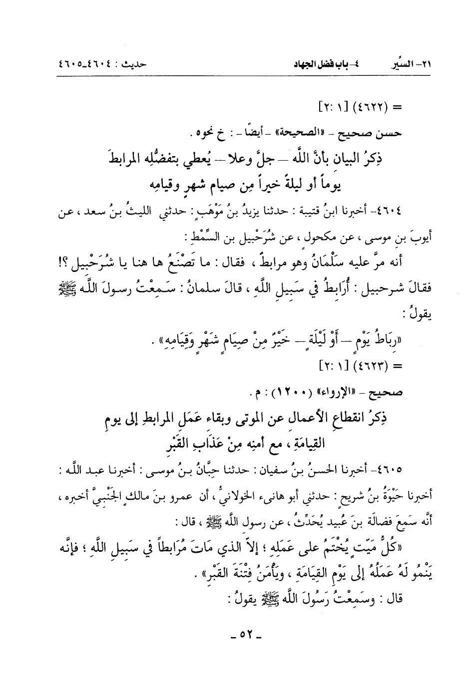 (كُلُّ مَيِّتٍ يُخْتَمُ عَلَى عَمَلِهِ إِلَّا الَّذِي مَاتَ مُرَابِطًا فِي سَبِيلِ اللَّهِ فَإِنَّهُ يَنْمُو لَهُ عَمَلُهُ إِلَى يَوْمِ الْقِيَامَةِ وَيَأْمَنُ فِتْنَةَ الْقَبْرِ)