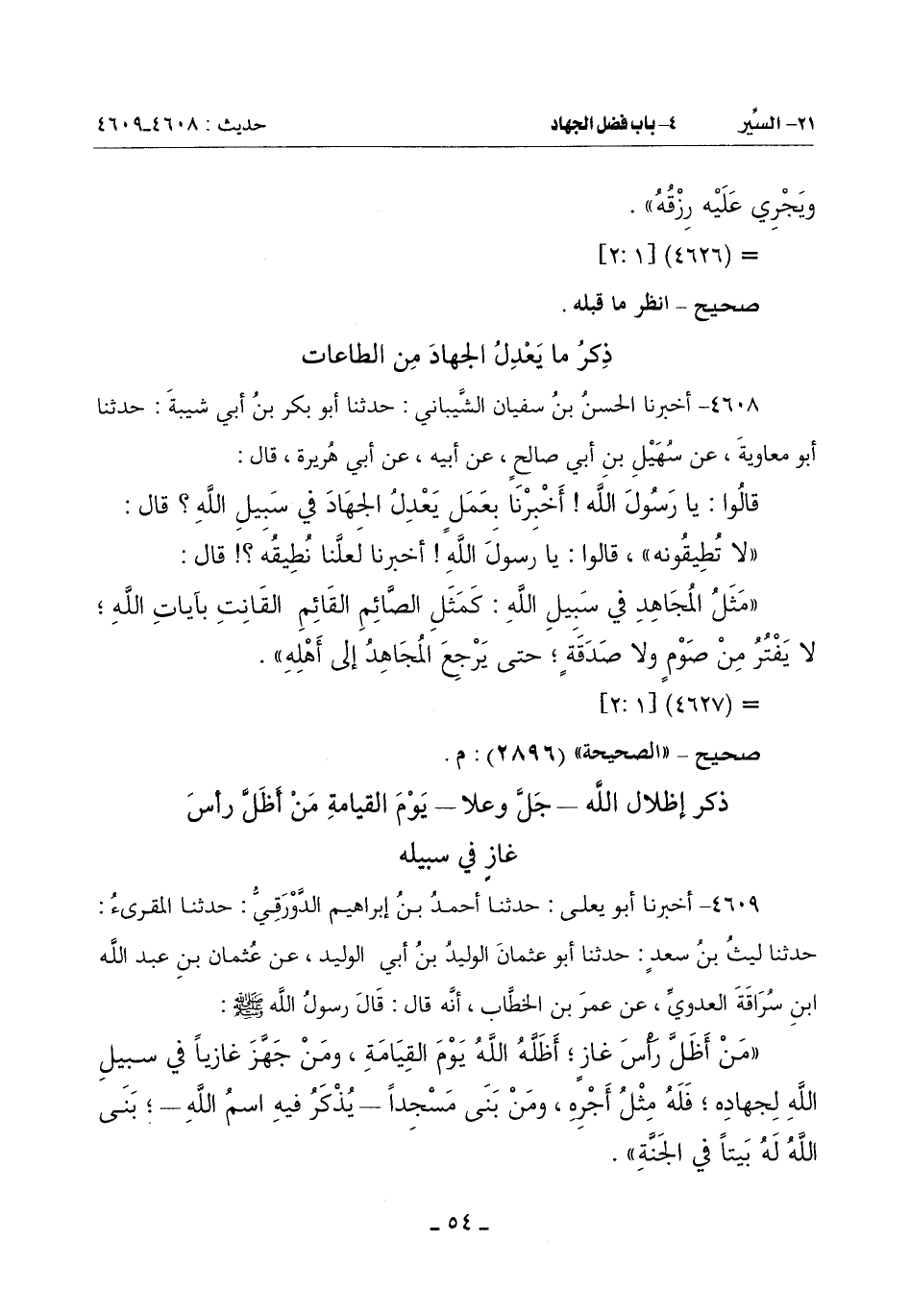 (مَنْ أَظَلَّ رَأْسَ غازٍ أَظَلَّهُ اللَّهُ يَوْمَ الْقِيَامَةِ وَمَنْ جهَّزَ غَازِيًا فِي سَبِيلِ اللَّهِ لِجِهَادِهِ فَلَهُ مِثْلُ أَجْرِهِ وَمَنْ بَنَى مَسْجِدًا ـ يُذْكَرُ فِيهِ اسْمَ اللَّهِ ـ بَنَى اللَّهُ لَهُ بَيْتًا فِي الْجَنَّةِ) -[55]-