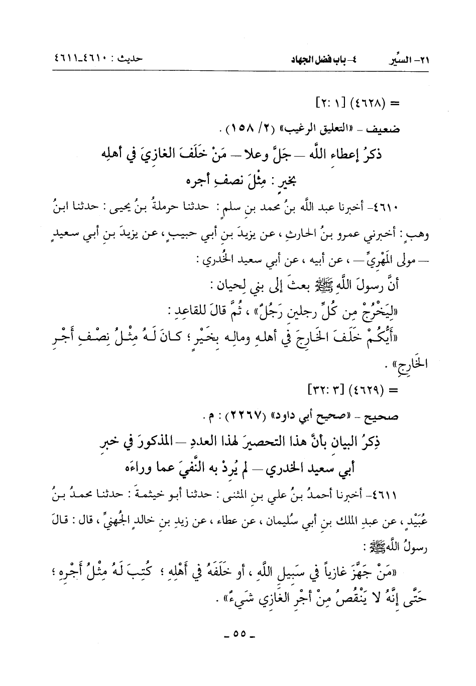 (من جهَّز غَازِيًا فِي سَبِيلِ اللَّهِ أَوْ خَلْفَهُ فِي أَهْلِهِ كُتِبَ لَهُ مثلُ أَجْرِهِ حَتَّى إِنَّهُ لَا يَنْقُصُ مِنْ أَجْرِ الْغَازِي شَيْءٌ) -[56]-