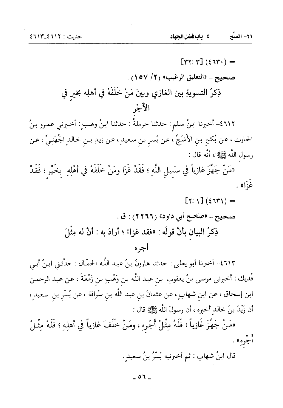 (مَنْ جَهَّزَ غَازِيًا فَلَهُ مِثْلُ أَجْرِهِ وَمَنْ خَلْفَ غَازِيًا فِي أَهْلِهِ فَلَهُ مِثْلُ أَجْرِهِ)