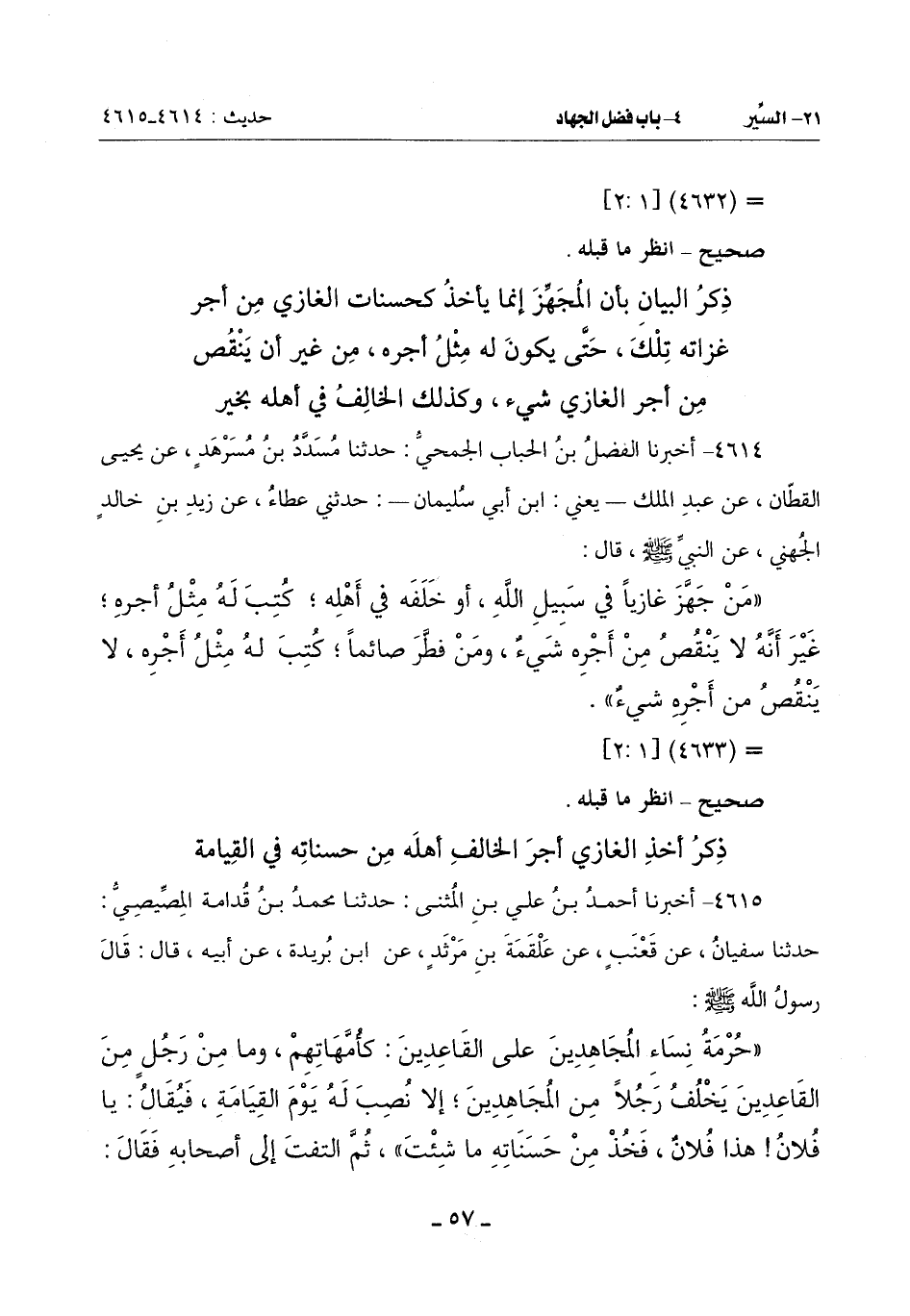 (حُرْمَةُ نِسَاءِ الْمُجَاهِدِينَ عَلَى الْقَاعِدِينَ كَأُمَّهَاتِهِمْ وَمَا مِنْ رَجُلٍ مِنَ الْقَاعِدِينَ يَخْلُفُ رَجُلًا مِنَ الْمُجَاهِدِينَ إِلَّا نُصِبَ لَهُ يَوْمَ الْقِيَامَةِ فَيُقَالُ: يَا فُلَانُ هَذَا فُلَانٌ فخُذ مِنْ حَسَنَاتِهِ مَا شِئْتَ ثُمَّ الْتَفَتَ إِلَى أَصْحَابِهِ فَقَالَ: -[58]-