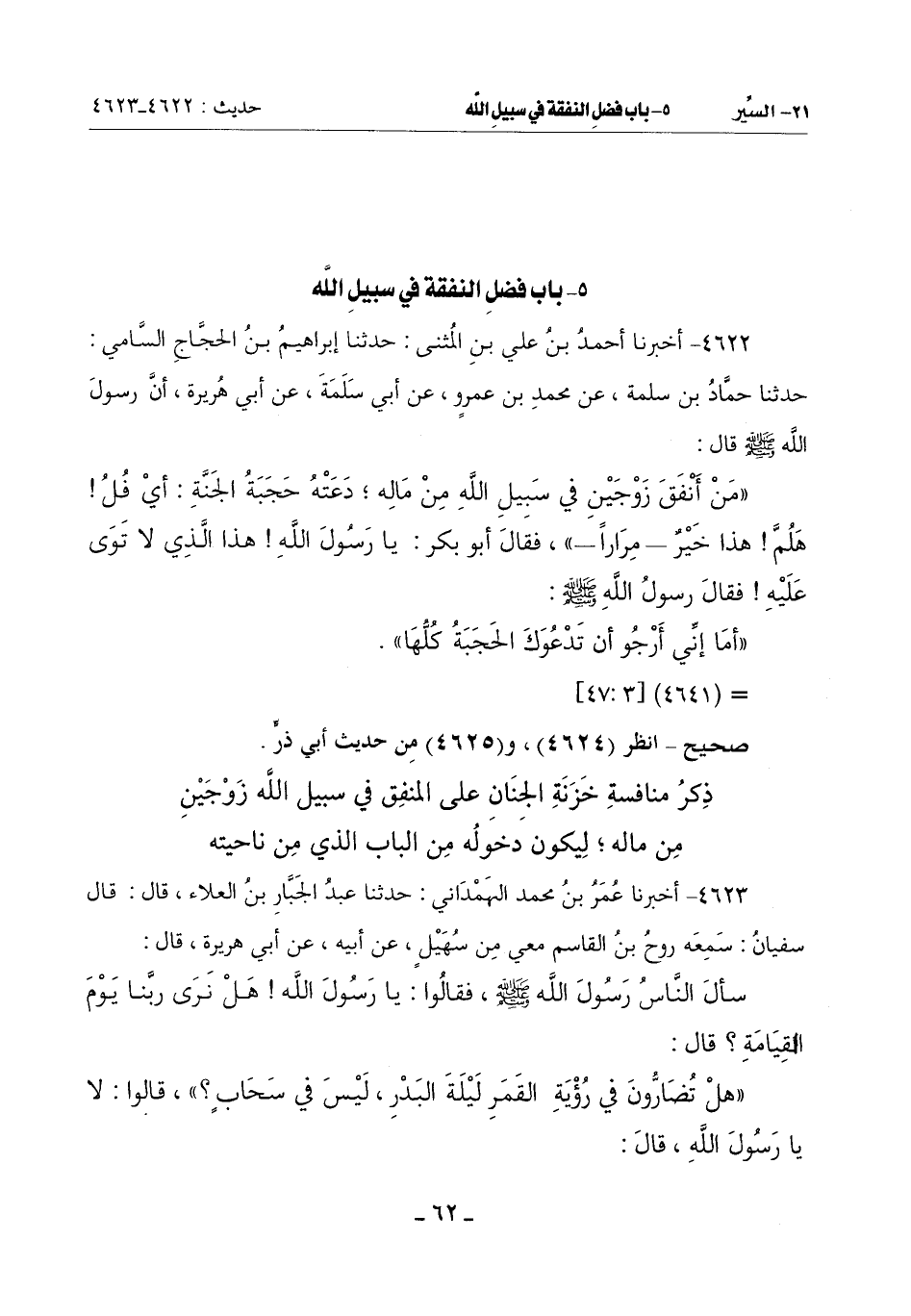 (مَنْ أَنْفَقَ زَوْجَيْنِ فِي سَبِيلِ اللَّهِ مِنْ مَالِهِ دَعَتْهُ حَجَبَةُ الْجَنَّةِ أَيْ فُلُ هَلُمَّ هَذَا خَيْرٌ ـ مِرَارًا ـ) فَقَالَ أَبُو بَكْرٍ: يَا رَسُولَ اللَّهِ هَذَا الَّذِي لَا تَوَى عَلَيْهِ فَقَالَ رَسُولُ اللَّهِ صَلَّى اللَّهُ عَلَيْهِ وَسَلَّمَ: