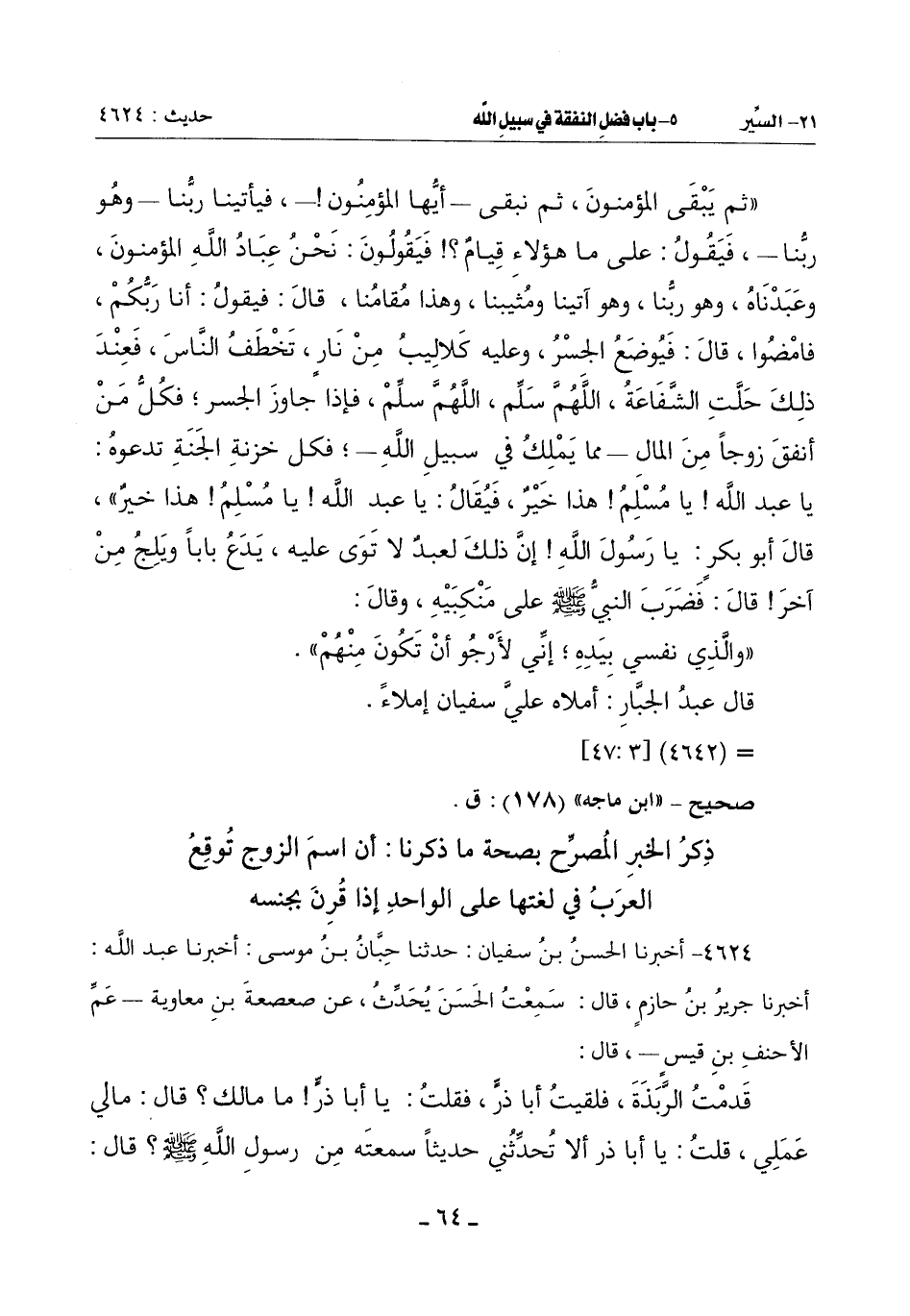 (مَا مِنْ رَجُلٍ أَنْفَقَ زَوْجَيْنِ مِنْ مَالِهِ فِي سَبِيلِ اللَّهِ إِلَّا ابْتَدَرَتْهُ حَجَبَةُ الْجَنَّةِ) قُلْتُ: وَمَا زَوْجَانٍ مِنْ مَالِهِ؟ قَالَ: عَبْدَانِ مِنْ رَقِيقِهِ فَرَسَانِ مِنْ خَيْلِهِ بَعِيرَانِ من إبله