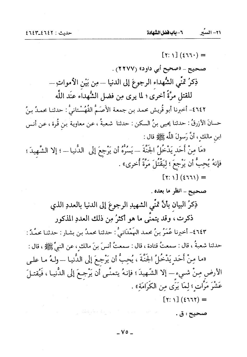 (مَا مِنْ أَحَدٍ يَدْخُلُ الْجَنَّةَ يُحِبُّ أَنْ يَرْجِعَ إِلَى الدُّنْيَا ـ وَلَهُ مَا عَلَى الْأَرْضِ مِنْ شَيْءٍ ـ إِلَّا الشَّهِيدُ فَإِنَّهُ يَتَمَنَّى أَنْ يَرْجِعَ إِلَى الدُّنْيَا فيُقتل عَشْرَ مَرَّاتٍ لِمَا يَرَى من الكرامة)