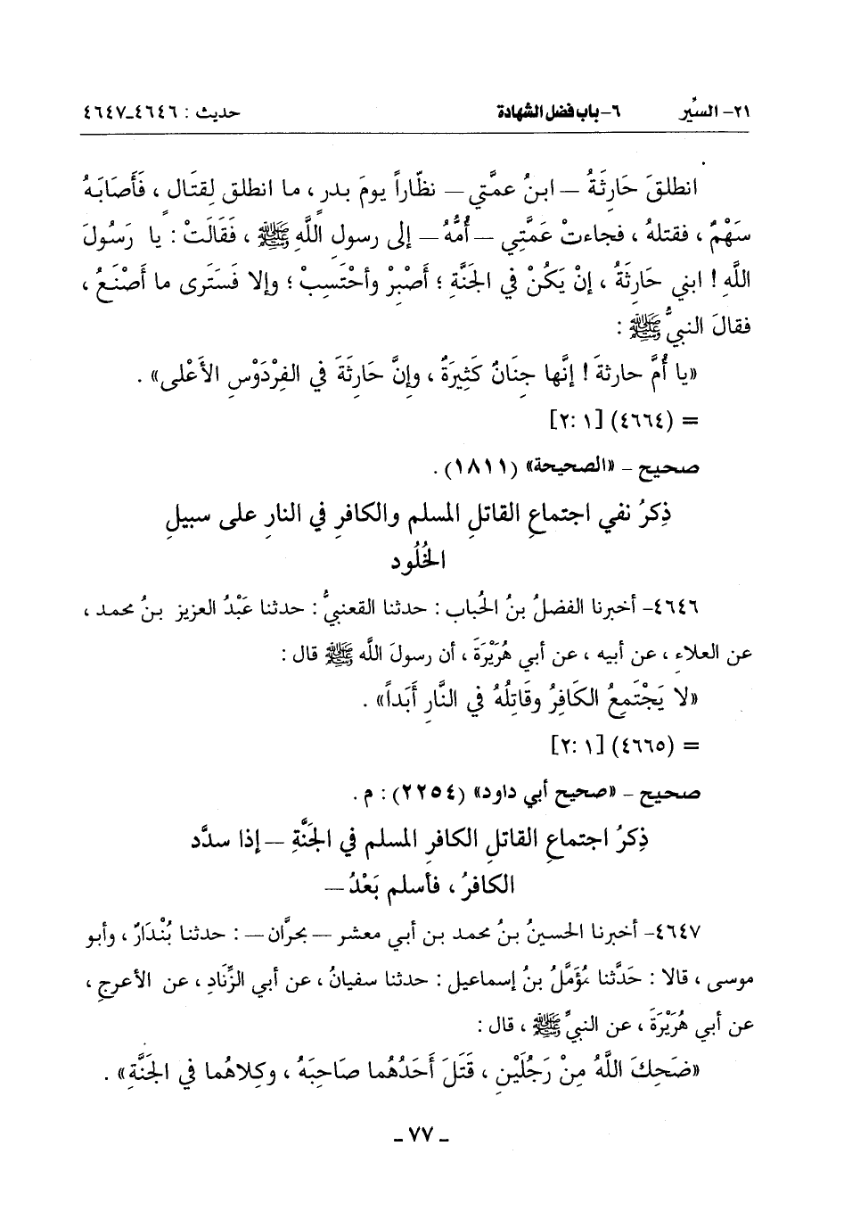 (ضَحِكَ اللَّهُ مِنْ رَجُلَيْنِ قَتَلَ أَحَدُهُمَا صَاحِبَهُ وَكِلَاهُمَا في الجنة) -[78]-