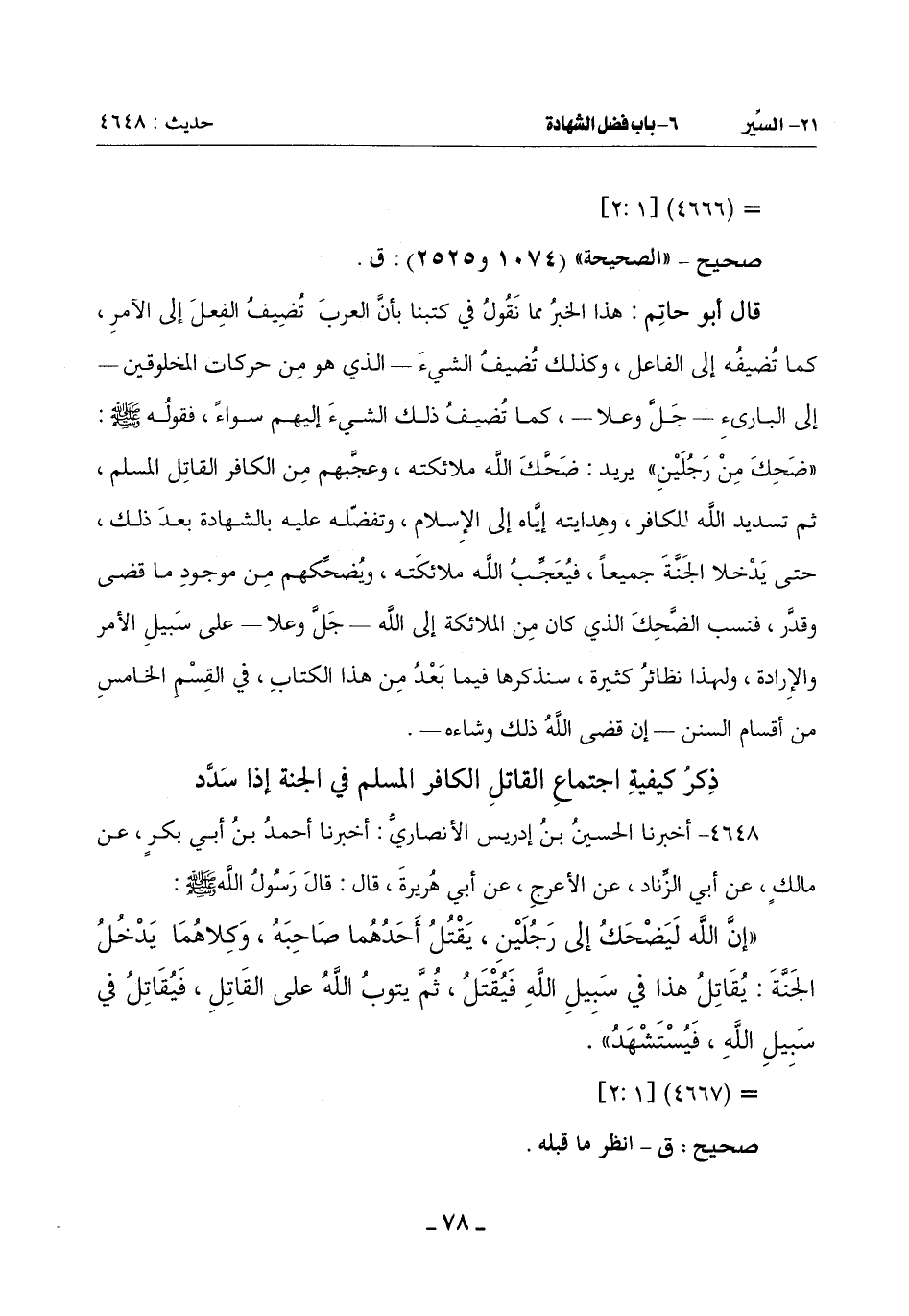 (إِنَّ اللَّهَ لَيَضْحَكُ إِلَى رَجُلَيْنِ يَقْتُلُ أَحَدُهُمَا صَاحِبَهُ وَكِلَاهُمَا يَدْخُلُ الْجَنَّةَ يُقَاتِلُ هَذَا فِي سَبِيلِ اللَّهِ فيُقتل ثُمَّ يَتُوبُ اللَّهُ عَلَى الْقَاتِلِ فيُقاتل فِي سَبِيلِ اللَّهِ فيُستشهد)