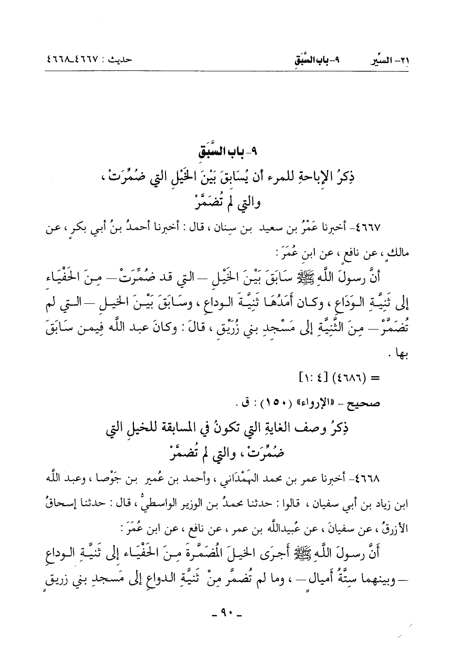 أَنَّ رَسُولَ اللَّهِ صَلَّى اللَّهُ عَلَيْهِ وَسَلَّمَ أَجْرَى الْخَيْلَ المُضَمَّرةَ مِنَ الْحَفْيَاءِ إِلَى ثَنِيَّةِ الْوَدَاعِ ـ وَبَيْنَهُمَا سِتَّةُ أَمْيَالٍ , وَمَا لَمْ تُضمَّر مِنْ ثَنِيَّةِ الْوَدَاعِ إِلَى مَسْجِدِ بَنِي زُرَيْقٍ -[91]- وَبَيْنَهُمَا ميلٌ ـ وَكُنْتُ فيمن أجرى
