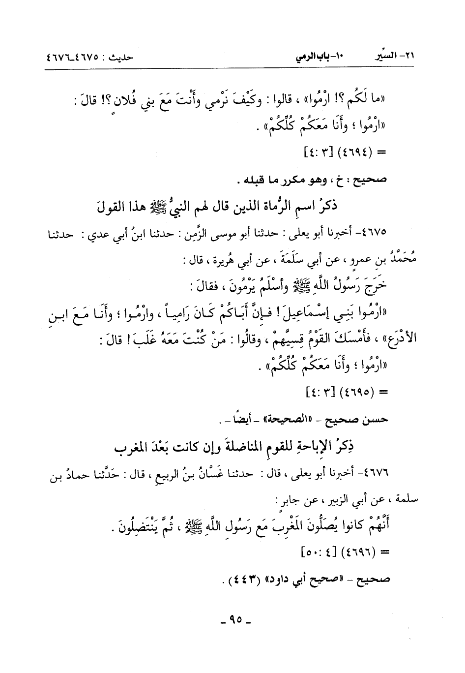 (ارْمُوا بَنِي إِسْمَاعِيلَ! فَإِنَّ أَبَاكُمْ كَانَ رَامِيًا وَارْمُوا وَأَنَا مَعَ ابْنِ الْأَدْرَعِ) فَأَمْسَكَ الْقَوْمُ قِسِيَّهمْ وَقَالُوا: مَنْ كُنْتَ مَعَهُ غَلَبَ قَالَ: