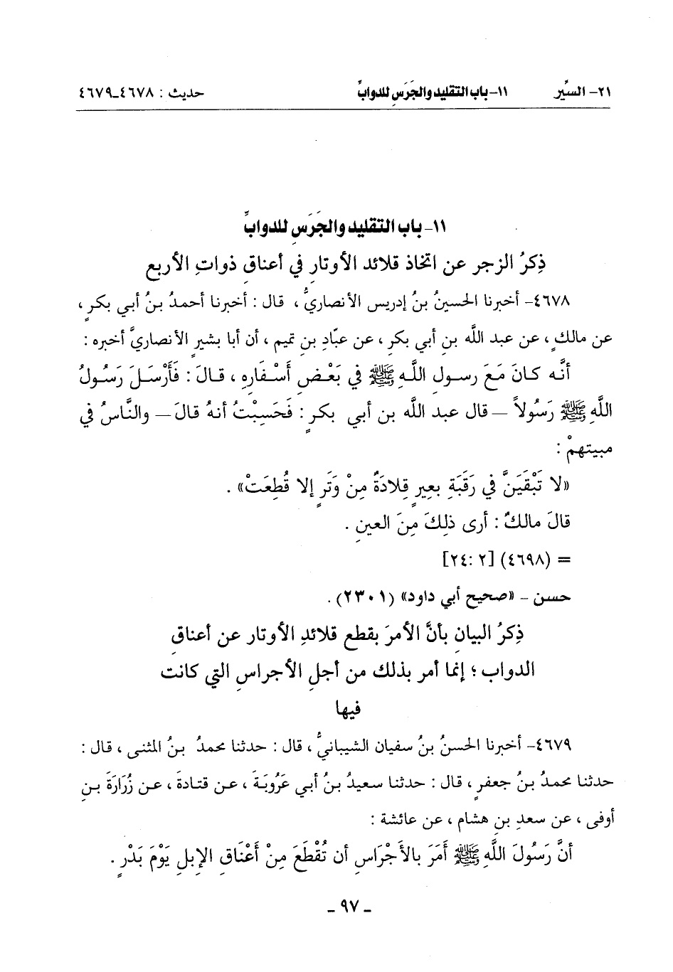 (لَا تَبْقيَنَّ فِي رقبةِ بعيرٍ قلادةٌ مِنْ وَتَرٍ إِلَّا قُطِعَتْ)