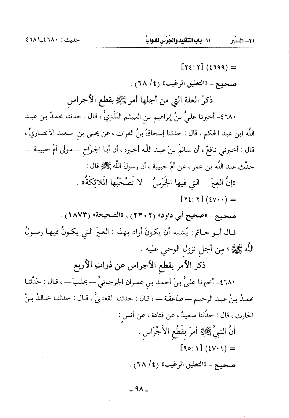 ذِكْرُ الْأَمْرِ بِقَطْعِ الْأَجْرَاسِ عَنْ ذَوَاتِ الْأَرْبَعِ