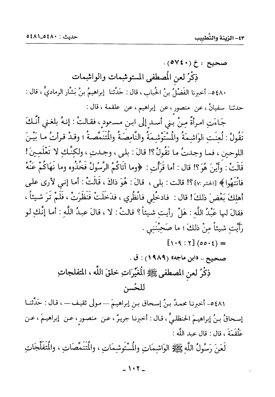 لَعَنَ رَسُولُ اللَّهِ صَلَّى اللَّهُ عَلَيْهِ وَسَلَّمَ الْوَاشِمَاتِ وَالْمُسْتَوْشِمَاتِ، والمتنمِّصات، والمتفلِّجات -[103]- لِلْحُسْنِ، الْمُغَيِّرَاتِ خَلْقَ اللَّهِ، قَالَ: فَبَلَغَ ذَلِكَ امْرَأَةً مِنْ بَنِي أَسَدٍ - يُقَالُ لَهَا: أُمُّ يَعْقُوبَ -؛ كَانَتْ تَقْرَأُ الْقُرْآنَ، فَأَتَتْهُ، فَقَالَتْ: مَا حَدِيثٌ بَلَغَنِي عَنْكَ أَنَّكَ لَعَنْتَ الْوَاشِمَاتِ وَالْمُسْتَوْشِمَاتِ، وَالْمُتَنَمِّصَاتِ، وَالْمُتَفَلِّجَاتِ لِلْحُسْنِ، الْمُغَيِّرَاتِ خَلْقَ اللَّهِ؟! فَقَالَ عَبْدُ اللَّهِ: وَمَا لِي لَا أَلْعَنُ مَنْ لَعَنَ رَسُولُ اللَّهِ صَلَّى اللَّهُ عَلَيْهِ وَسَلَّمَ، وَهُوَ فِي كِتَابِ اللَّهِ؟! قَالَتِ الْمَرْأَةُ: لَقَدْ قَرَأْتُ مَا بَيْنَ لَوْحَيِ الْمُصْحَفِ، فَمَا وَجَدْتُهُ؟! قَالَ: وَاللَّهِ إِنْ كُنْتِ قَرَأْتِيهِ لَقَدْ وَجَدْتِيهِ! ثُمَّ قَالَ: {وَمَا آتَاكُمُ الرَّسُولُ فَخُذُوهُ وَمَا نَهَاكُمْ عَنْهُ فَانْتَهُوا} [الحشر: 7]؛ قَالَ: قَالَتِ الْمَرْأَةُ: فَإِنِّي أَرَى شَيْئًا مِنْ هَذَا الْآنَ عَلَى امْرَأَتِكَ! قَالَ: فَاذْهَبِي فَانْظُرِي، قَالَ: فَدَخَلَتْ عَلَى امْرَأَةِ عَبْدِ اللَّهِ، فَلَمْ ترى شَيْئًا، فَجَاءَتْ إِلَيْهِ، فَقَالَتْ: مَا رَأَيْتُ شَيْئًا، فقال: أما لوكان ذلك؛ لم نجامعها.