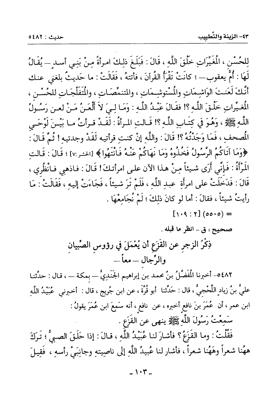 5482 - أَخْبَرَنَا الْمُفَضَّلُ بْنُ مُحَمَّدِ بْنِ إِبْرَاهِيمَ الْجَنَدِيُّ - بِمَكَّةَ -، قَالَ: حَدَّثَنَا عَلِيُّ بْنُ زِيَادٍ اللَّحْجِيُّ، قَالَ: حَدَّثَنَا أَبُو قُرَّةَ، عَنِ ابْنِ جُرَيْجٍ، قَالَ: أَخْبَرَنِي عُبَيْدُ اللَّهِ بْنُ عُمَرَ، أَنَّ عُمَرَ بْنَ نَافِعٍ أَخْبَرَهُ، عَنْ نَافِعٍ، أَنَّهُ سَمِعَ ابْنَ عُمَرَ يَقُولُ: