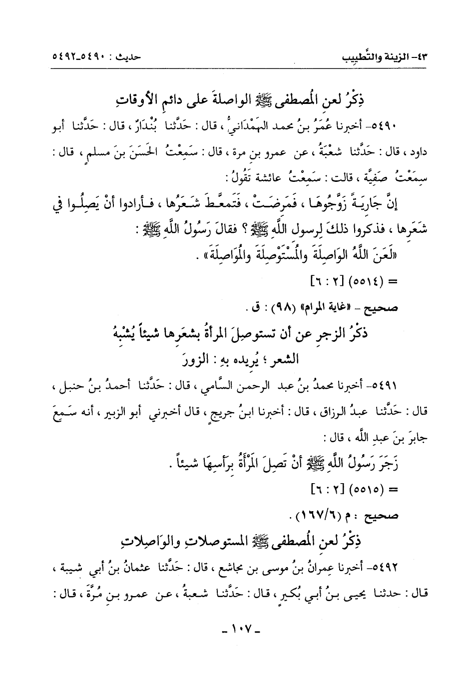 ذِكْرُ لَعْنِ الْمُصْطَفَى صَلَّى اللَّهُ عَلَيْهِ وَسَلَّمَ الْوَاصِلَةَ عَلَى دَائِمِ الْأَوْقَاتِ