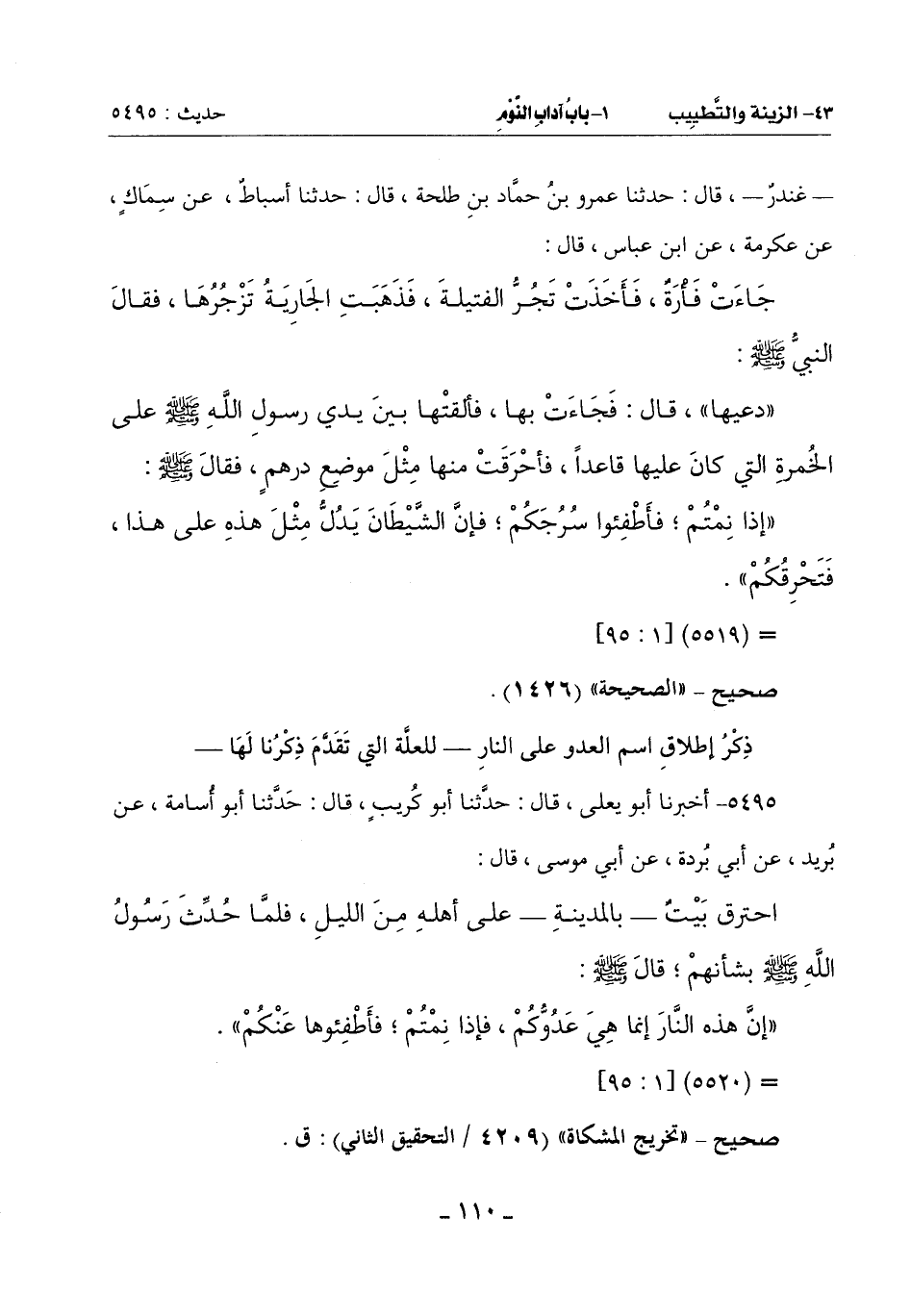 ((إِنَّ هَذِهِ النَّارَ إِنَّمَا هِيَ عَدُوُّكُمْ، فَإِذَا نِمْتُمْ؛ فأطفئوها عنكم)).