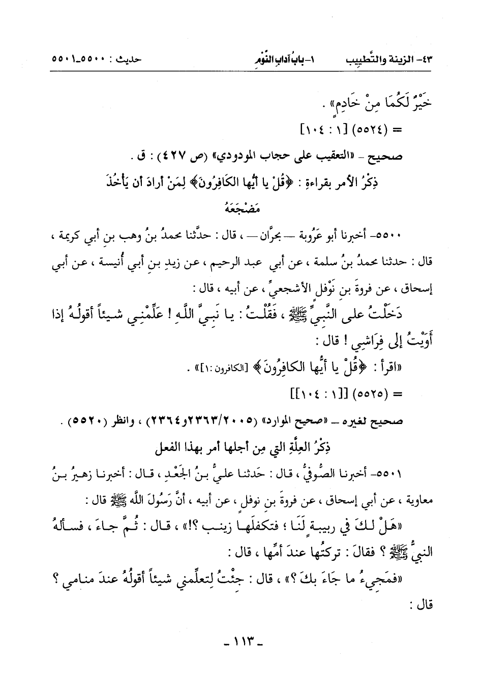 ((فَمَجِيءٌ مَا جَاءَ بِكَ؟ ))، قَالَ: جِئْتُ لِتعلِّمني شَيْئًا أَقُولُهُ عِنْدَ مَنَامِي؟ قَالَ: -[114]-