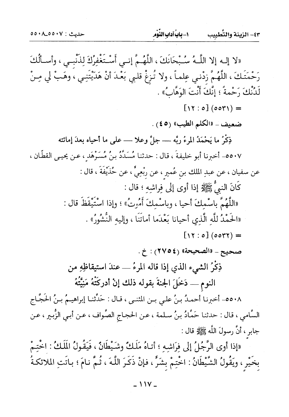 ((إِذَا أَوَى الرَّجُلُ إِلَى فِرَاشِهِ؛ أَتَاهُ مَلَكٌ وَشَيْطَانٌ، فَيَقُولُ الْمَلَكُ: اخْتِمْ بِخَيْرٍ، وَيَقُولُ الشَّيْطَانُ: اخْتِمْ بِشَرٍّ، فَإِنْ ذَكَرَ اللَّهَ، ثُمَّ نَامَ؛ بَاتَتِ الْمَلَائِكَةُ -[118]- تكلأه، فَإِنِ اسْتَيْقَظَ قَالَ الْمَلَكُ: افْتَحْ بِخَيْرٍ وَقَالَ الشَّيْطَانُ: افْتَحْ بِشَرٍّ، فَإِنْ قَالَ: الْحَمْدُ لِلَّهِ الَّذِي رَدَّ عَلَيَّ نَفْسِي، وَلَمْ يُمِتْهَا فِي مَنَامِهَا، الْحَمْدُ لِلَّهِ الَّذِي {يُمْسِكُ السَّمَاوَاتِ وَالْأَرْضَ أن تزولا .... } إلى آخر الآية [فاطر: 41]، الْحَمْدُ لِلَّهِ الَّذِي {يُمْسِكُ السَّمَاءَ أَنْ تَقَعَ على الأرض إلا بإذنه .... } [الحج: 65]، فَإِنْ وَقَعَ مِنْ سَرِيرِهِ فَمَاتَ؛ دَخَلَ الْجَنَّةَ)).