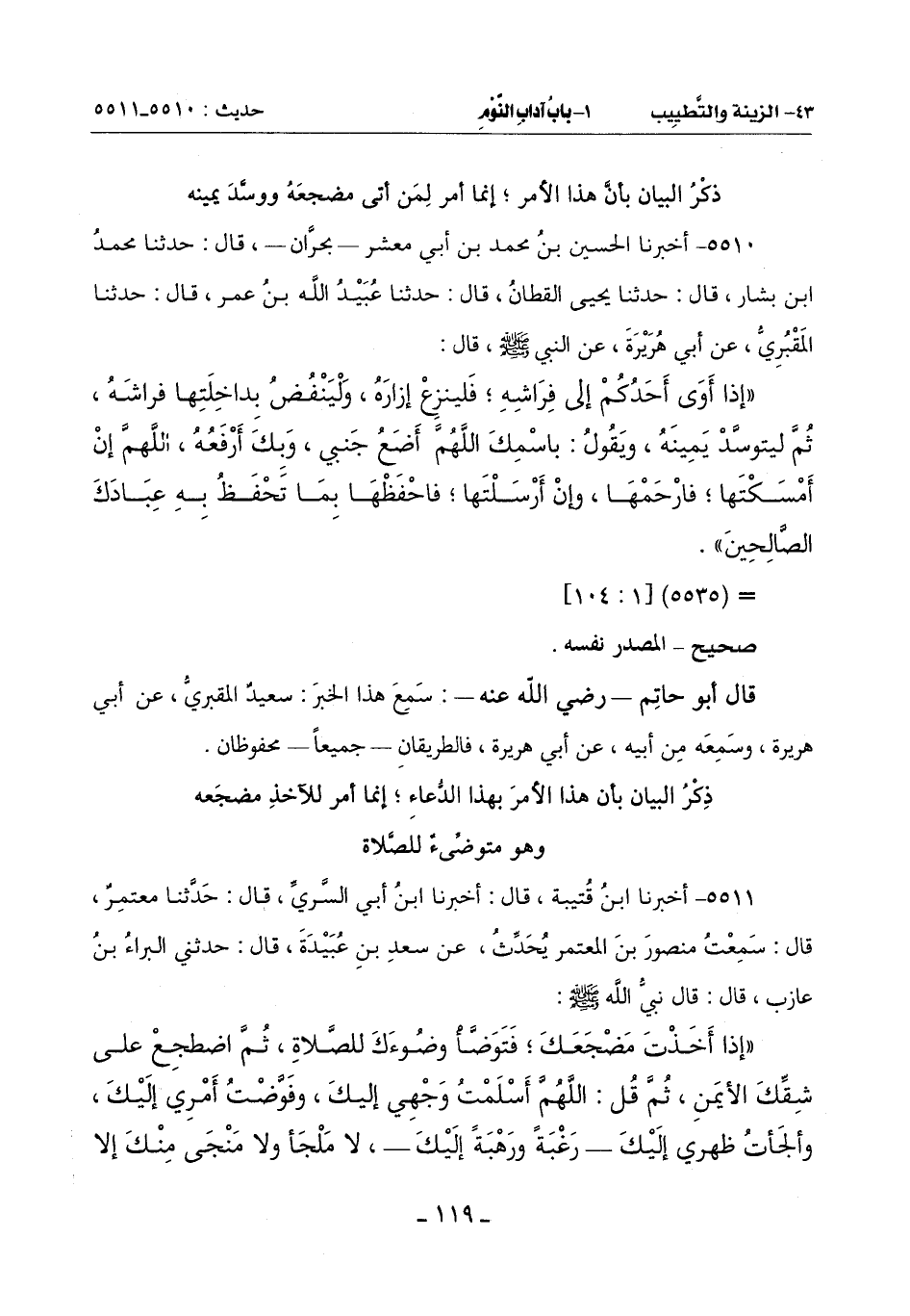 ((إِذَا أَوَى أَحَدُكُمْ إِلَى فِرَاشِهِ؛ فَلْيَنْزِعْ إِزَارَهُ وَلْيَنْفُضْ بِدَاخِلَتِهَا فِرَاشَهُ , ثُمَّ ليتوسَّد يَمِينَهُ , وَيَقُولُ: بِاسْمِكَ اللَّهُمَّ أَضَعُ جَنْبِي , وَبِكَ ارْفَعُهُ , اللَّهُمَّ إِنْ أَمْسَكْتَهَا؛ فَارْحَمْهَا , وَإِنْ أَرْسَلْتَهَا؛ فَاحْفَظْهَا بما تحفظ به عباد الصالحين)).