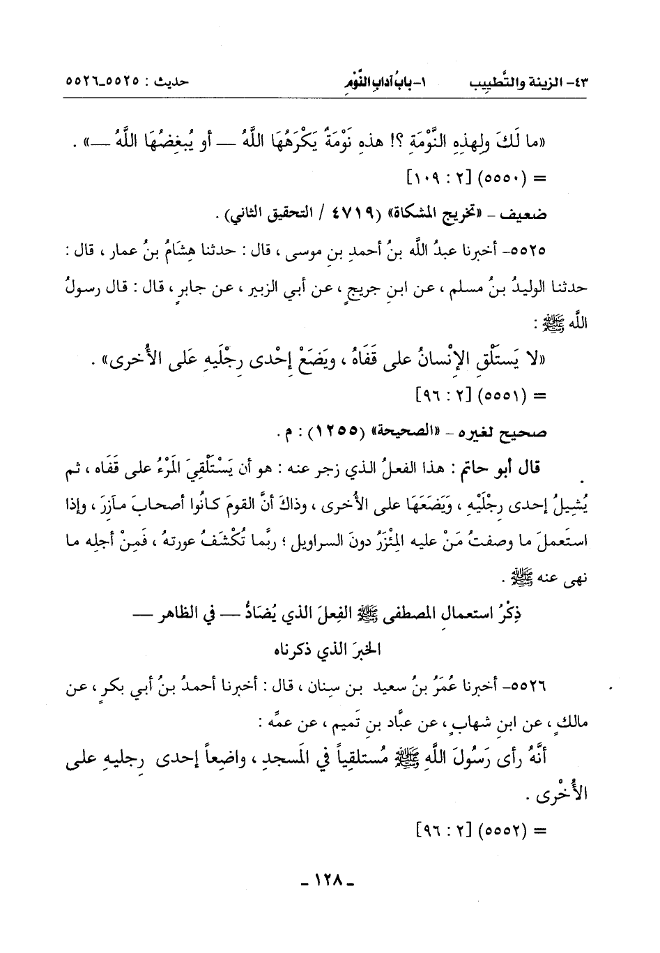 قَالَ أَبُو حَاتِمٍ: هَذَا الْفِعْلُ الَّذِي اسْتَعْمَلَهُ صَلَّى اللَّهُ عَلَيْهِ وَسَلَّمَ: هُوَ مَدَّ الرِّجْلَيْنِ جَمِيعًا، وَوَضْعُ إِحْدَاهُمَا عَلَى الْأُخْرَى , دُونَ ذَلِكَ الْفِعْلِ الَّذِي نَهَى عَنْهُ , وَهُوَ ضِدُّ قَوْلِ مَنْ جَهِلَ صِنَاعَةَ الْحَدِيثِ , فَزَعَمَ أَنَّ أَخْبَارَ الْمُصْطَفَى صَلَّى اللَّهُ عَلَيْهِ وَسَلَّمَ تَتَضادُّ وتَتَهاتَرُ.