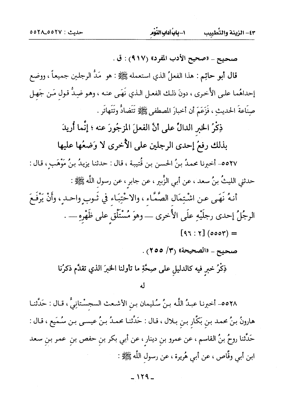 5527 - أَخْبَرَنَا مُحَمَّدُ بْنُ الْحَسَنِ بْنِ قُتَيْبَةَ , قَالَ: حَدَّثَنَا يَزِيدُ بْنُ مَوْهَبٍ , قَالَ: حَدَّثَنِي اللَّيْثُ بْنُ سَعْدٍ , عَنْ أَبِي الزُّبَيْرِ , عَنْ جَابِرٍ , عَنْ رَسُولِ اللَّهِ صَلَّى اللَّهُ عَلَيْهِ وَسَلَّمَ: