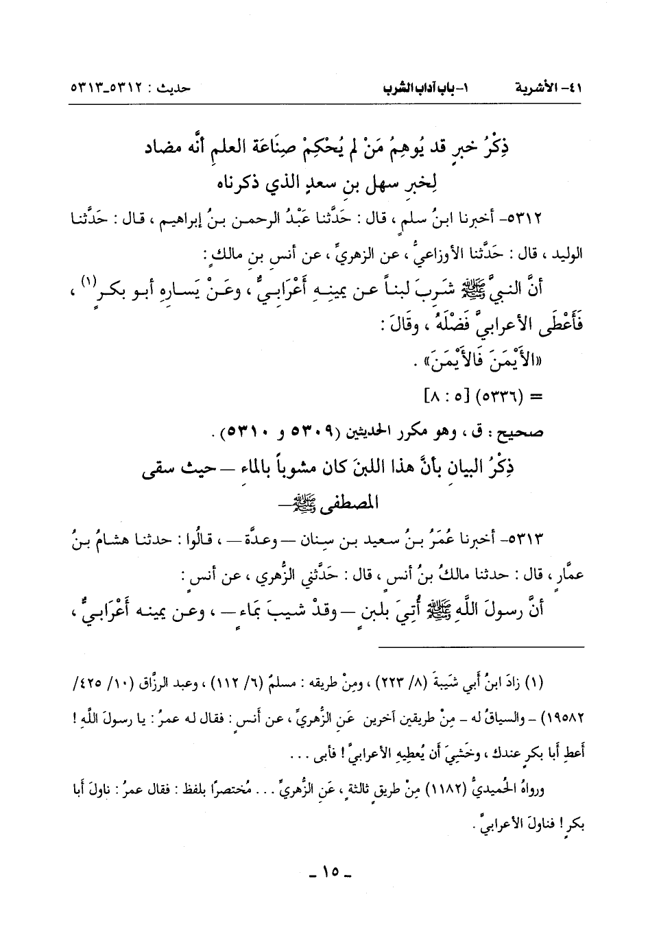 أَنَّ رَسُولَ اللَّهِ صَلَّى اللَّهُ عَلَيْهِ وَسَلَّمَ أُتِيَ بِلَبَنٍ - وَقَدْ شِيبَ بِمَاءٍ -، وَعَنْ يَمِينِهِ أَعْرَابِيٌّ، -[16]- وَعَنْ يَسَارِهِ أَبُو بَكْرٍ، فَشَرِبَ النبي صلى الله عليه وسلم، ثم أعطى الأعرابي، وقال: