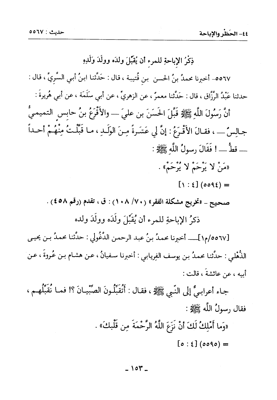 جَاءَ أَعْرَابِيٌّ إِلَى النَّبِيِّ صَلَّى اللَّهُ عَلَيْهِ وَسَلَّمَ , فَقَالَ: أَتُقَبِّلُون الصِّبْيَانَ؟! فَمَا نُقَبِّلُهم , فَقَالَ رَسُولُ اللَّهِ صَلَّى اللَّهُ عَلَيْهِ وَسَلَّمَ: