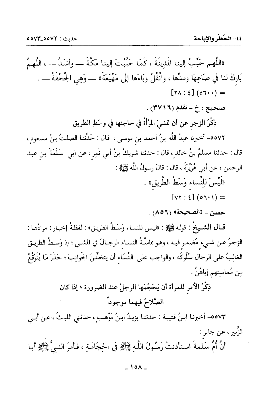 قَالَ الشَّيْخُ: قَوْلُهُ صَلَّى اللَّهُ عَلَيْهِ وَسَلَّمَ: (لَيْسَ لِلنِّسَاءِ وَسَطُ الطَّرِيقِ) لَفْظَةُ إِخْبَارٍ مُرَادُهَا الزَّجْرُ عَنْ شَيْءٍ مُضْمَرٍ فِيهِ وَهُوَ مماسَّةُ النِّسَاءِ الرِّجَالَ فِي الْمَشْيِ إِذْ وَسَطُ الطَّرِيقِ الْغَالِبُ عَلَى الرِّجَالِ سُلُوكُهُ وَالْوَاجِبُ عَلَى النِّسَاءِ أَنْ يَتَخَلَّلْنَ الْجَوَانِبَ حَذَرَ مَا يُتَوَقَّعُ مِنْ مماستهم إياهن