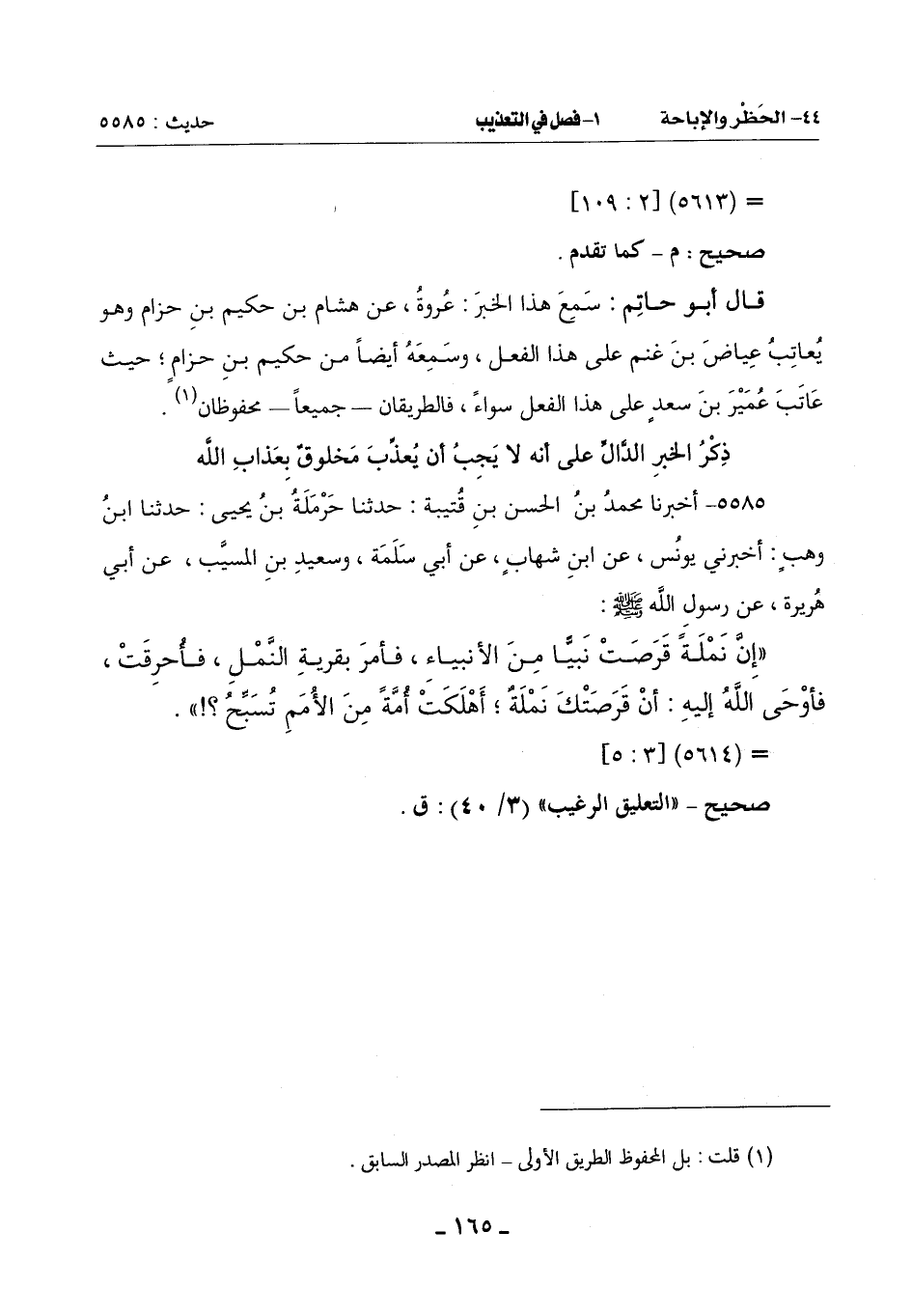 ((إن نَمْلَةً قَرَصَتْ نَبياً مِنَ الْأَنْبِيَاءِ , فأمرَ بقريةِ النَّمْلِ , فأُحرِقَتْ فَأَوْحَى اللَّهُ إِلَيْهِ: أنْ قَرَصَتْكَ نملة؛ أَهْلَكَتْ أُمَّةً من الأُمم تُسَبِّحُ؟! ))