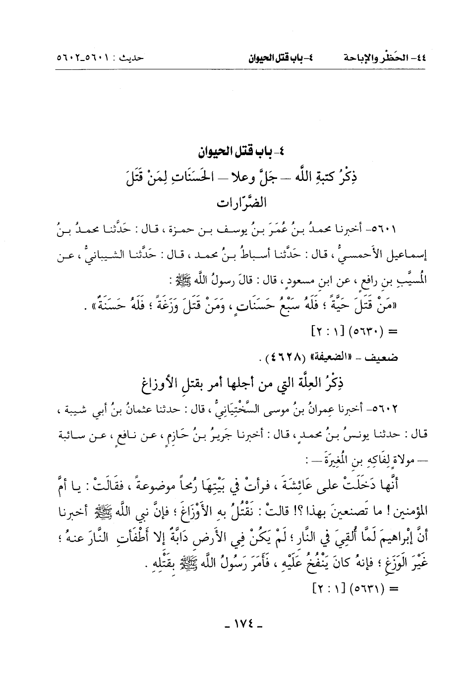 ((مَنْ قَتَلَ حَيَّةً؛ فَلَهُ سَبْعُ حسنات , ومن قَتَلَ وَزَغَةً؛ فَلَهُ حسنة)).