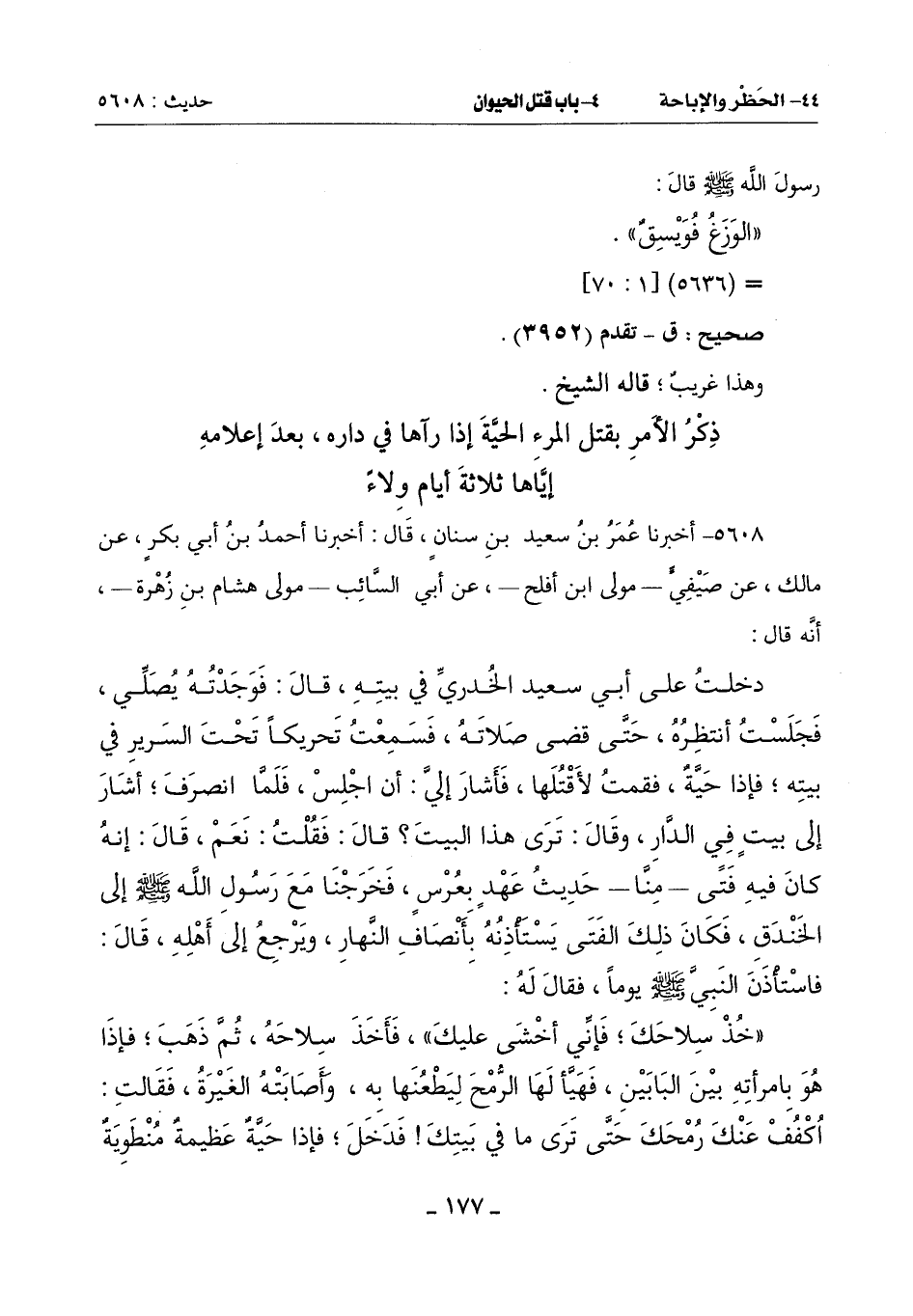 دَخَلْتُ عَلَى أَبِي سَعِيدٍ الْخُدْرِيِّ فِي بَيْتِهِ , قَالَ: فَوَجَدْتُهُ يُصَلِّي , فَجَلَسْتُ أنتظِرُهُ , حَتَّى قَضَى صَلَاتَهُ , فَسَمِعْتُ تَحْرِيكًا تَحْتَ السَّرِيرِ فِي بَيْتِهِ؛ فَإِذَا حَيَّةٌ , فقمتُ لأَقْتُلَها , فَأَشَارَ إِلَيَّ: أَنِ اجْلِسْ , فَلَمَّا انْصَرَفَ؛ أَشَارَ إِلَى بيتٍ فِي الدَّارِ , وَقَالَ: تَرَى هَذَا الْبَيْتَ؟ قَالَ: فَقُلْتُ: نَعَمْ , قَالَ: إِنَّهُ كَانَ فِيهِ فَتىً - مِنَّا - حديثُ عهدٍ بِعُرْسٍ , فَخَرَجْنَا مَعَ رَسُولِ اللَّهِ صَلَّى اللَّهُ عَلَيْهِ وَسَلَّمَ إِلَى الْخَنْدَقِ , فَكَانَ ذَلِكَ الْفَتَى يَسْتَأْذِنُهُ بِأَنْصَافِ النَّهَارِ , وَيَرْجِعُ إِلَى أَهْلِهِ , قَالَ: فَاسْتَأْذَنَ النَّبِيَّ صَلَّى اللَّهُ عَلَيْهِ وَسَلَّمَ يَوْمًا , فَقَالَ لَهُ:
