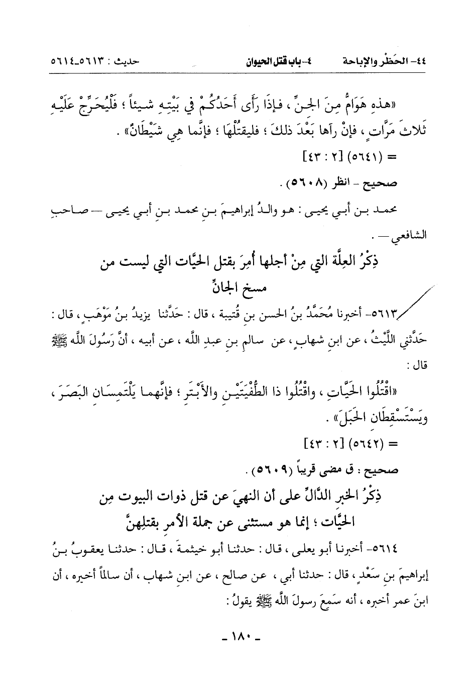 قَالَ ابْنُ عُمَرَ: مَا كُنْتُ أدعُ حَيَّةً إِلَّا قَتَلْتُهَا , حَتَّى رَآنِي أَبُو لُبَابَةَ بْنُ عَبْدِ الْمُنْذِرِ , وَزَيْدُ بْنُ الْخَطَّابِ وَأَنَا أُطَارِدُ حَيَّةً مِنْ حَيَّاتِ الْبُيُوتِ , فَنَهَيَانِي عَنْ قَتْلِهَا , فَقُلْتُ: إِنَّ رَسُولَ اللَّهِ صَلَّى اللَّهُ عَلَيْهِ وَسَلَّمَ أَمَرَ بِقَتْلِهِنَّ؟! فَقَالَا: إِنَّهُ نَهَى عَنْ قتل ذوات البيوت.