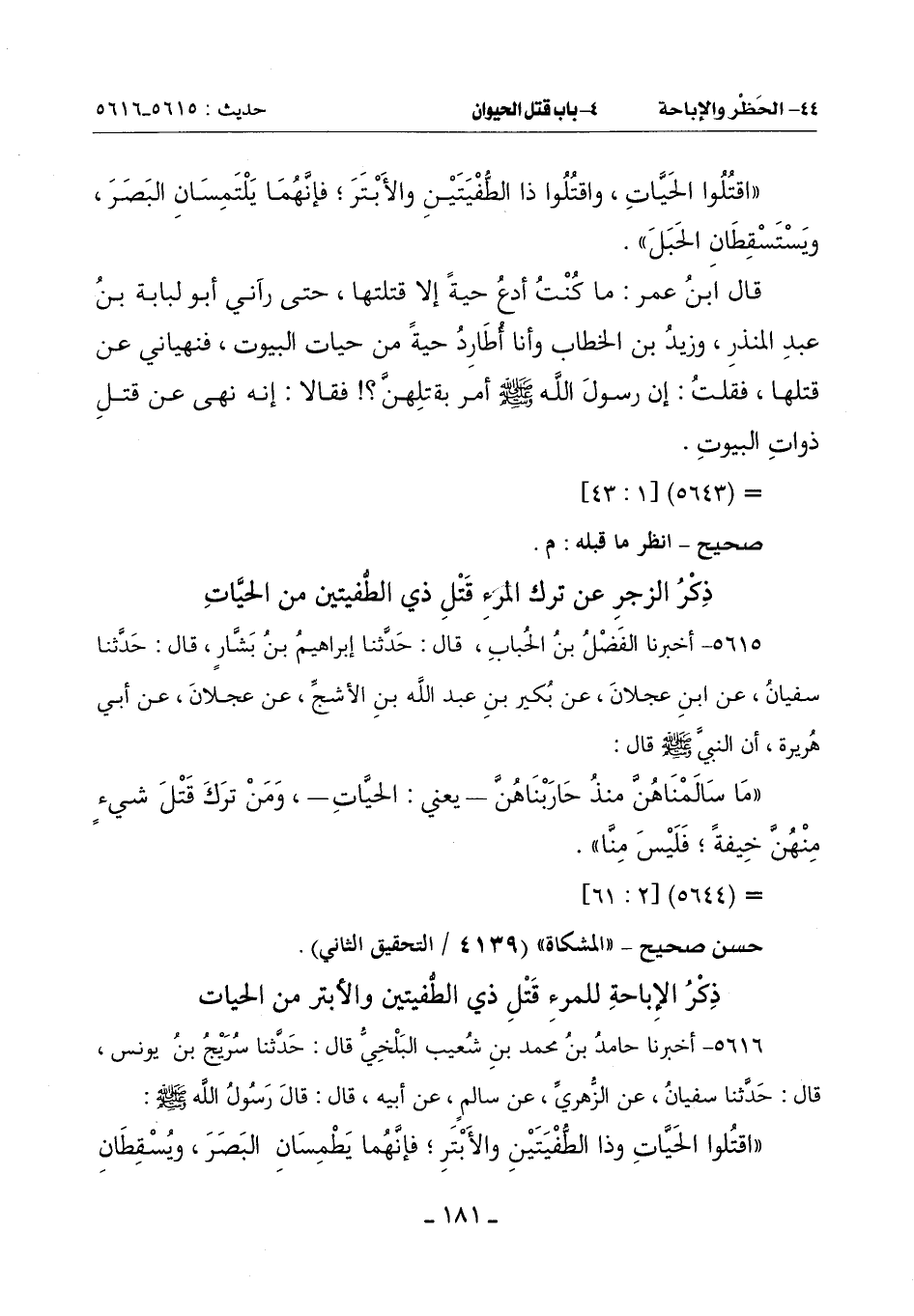 ((اقْتُلُوا الْحَيَّاتِ وَذَا الطُّفْيَتَيْنِ وَالْأَبْتَرَ؛ فَإِنَّهُمَا يَطْمِسَان الْبَصَرَ , ويُسقطان -[182]- الْحَبَلَ)).