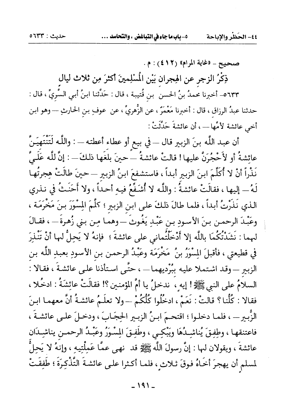 أَنَّ عَبْدَ اللَّهِ بْنَ الزُّبَيْرِ قَالَ - فِي بيعٍ أَوْ عَطَاءٍ أَعْطَتْهُ -: وَاللَّهِ لَتَنْتَهِيَنَّ عَائِشَةُ أَوْ لأَحْجُرَنَّ عَلَيْهَا! قَالَتْ عَائِشَةُ - حِينَ بَلَغَهَا ذَلِكَ -: إِنَّ لِلَّهِ عَلَيَّ نَذْرًا أَنْ لَا أُكَلِّمَ ابْنَ الزُّبَيْرِ أَبَدًا , فَاسْتَشْفَعَ ابْنَ الزُّبَيْرِ- حِينَ طَالَتْ هِجرتُها لَهُ - إِلَيْهَا , فَقَالَتْ عَائِشَةُ: وَاللَّهِ لَا أُشَفِّعُ فِيهِ أَحَدًا , وَلَا أَحَنَثُ فِي نَذْرِي الَّذِي نَذَرْتُ أَبَدًا , فَلَمَّا طَالَ ذَلِكَ عَلَى ابْنِ الزُّبَيْرِ؛ كلَّم الْمِسْوَرَ بْنَ مَخْرَمَةَ , وَعَبْدَ الرَّحْمَنِ بْنَ الْأَسْوَدِ بْنِ عَبْدِ يَغُوثَ - وَهُمَا مِنْ بَنِي زُهرة - فَقَالَ لَهُمَا: نَشَدْتُكُمَا بِاللَّهِ إِلَّا أَدْخَلْتُماني عَلَى عَائِشَةَ؛ فَإِنَّهُ لَا يَحِلُّ لَهَا أَنْ تَنْذِرَ فِي قَطِيعَتِي , فَأَقْبَلَ الْمِسْوَرُ بْنُ مَخْرَمَةَ وَعَبْدُ الرَّحْمَنِ بْنُ الْأَسْوَدِ بِعَبْدِ اللَّهِ بْنِ الزُّبَيْرِ - وَقَدِ اشْتَمَلَا عَلَيْهِ بِبُرْديهما - , حَتَّى اسْتَأْذَنَا عَلَى عَائِشَةَ , فَقَالَا: السَّلَامُ عَلَى النَّبِيِّ صَلَّى اللَّهُ عَلَيْهِ وَسَلَّمَ! إيهٍ , ندخلُ يَا أُمَّ الْمُؤْمِنِينَ؟! فَقَالَتْ عائشةُ ,: ادْخُلَا , فَقَالَا: كُلُّنا؟ قَالَتْ: نَعَمِ ادْخُلُوا كُلُّكُمْ - وَلَا تعلَمُ عَائِشَةُ أَنَّ مَعَهُمَا ابْنَ الزُّبَيْرِ - , فَلَمَّا دَخَلُوا؛ اقْتَحَمَ ابْنُ الزُّبَيْرِ الْحِجَابَ , وَدَخَلَ عَلَى عَائِشَةَ فَاعْتَنَقَهَا وطِفِقَ يُناشدها وَيَبْكِي , وطَفِقَ المِسْوَرُ وَعَبْدُ الرَّحْمَنِ يُنَاشِدَانِ عَائِشَةَ , وَيَقُولَانِ لَهَا: إِنَّ رَسُولَ اللَّهِ صَلَّى اللَّهُ عَلَيْهِ وَسَلَّمَ قَدْ نَهَى عمَّا عَمِلْتِيهِ , وَإِنَّهُ لَا يَحِلُّ لمسلمٍ أَنْ يَهْجُرَ أَخَاهُ فَوْقَ ثَلَاثٍ , فَلَمَّا أَكْثَرَا عَلَى عَائِشَةَ التَّذْكِرَةَ؛ طَفِقَتْ -[192]- تذكِّرهم وَتَبْكِي , وَتَقُولُ: إِنِّي نَذَرْتُ , وَالنَّذْرُ شَدِيدٌ! فَلَمْ يَزَالَا بِهَا , حَتَّى كَلَّمَتِ ابْنَ الزُّبَيْرِ , ثُمَّ أَعْتَقَتْ - عَنْ نَذْرِهَا ذَلِكَ - أَرْبَعِينَ رَقَبَةً , ثُمَّ كَانَتْ - بَعْدَمَا أَعْتَقَتْ أَرْبَعِينَ رقبة - تبكي حتى تَبُلَّ دموعها خِمَارَها.