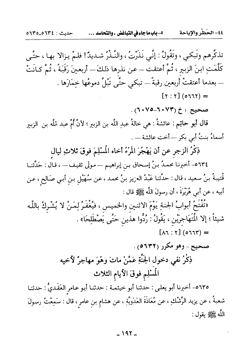 ذِكْرُ نَفْيِ دُخُولِ الْجَنَّةِ عمَّن مَاتَ وَهُوَ مُهَاجِرٌ لِأَخِيهِ الْمُسْلِمِ فَوْقَ الْأَيَّامِ الثَّلَاثِ
